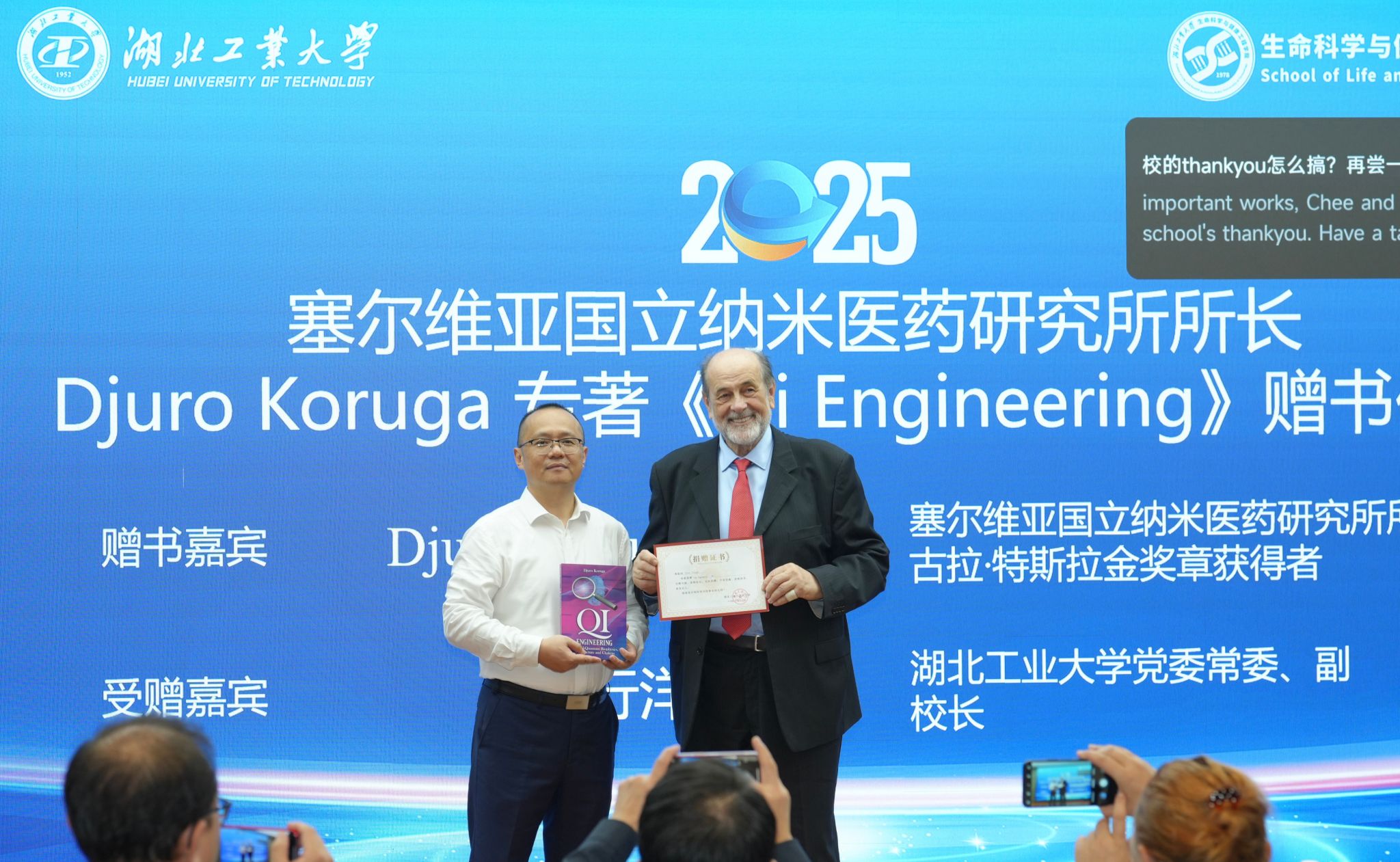 当天下午,专家学者围绕生命科学、纳米医学、食品安全、表观遗传与视觉神经疾病等前沿议题展开高水平的学术交流。贺行洋代表学校致欢迎辞。在签约仪式上,湖北工业大学与塞尔维亚国立生物研究所正式签署共建“一带一路”联合实验室合作协议,标志着双方合作进入机制化、常态化、实质化的新阶段,为未来在生物医药、分子科学与健康工程等领域的深度合作奠定了坚实基础。现场,塞尔维亚贝尔格莱德大学纳米研究所所长、尼古拉·特斯拉金奖章获得者道乐·科路伽教授还将其专著《Qi Engineering》赠予学校,象征中塞两国在科技与文化层面的深厚友谊。贺行洋代表学校回赠纪念品,以表诚挚谢意。
