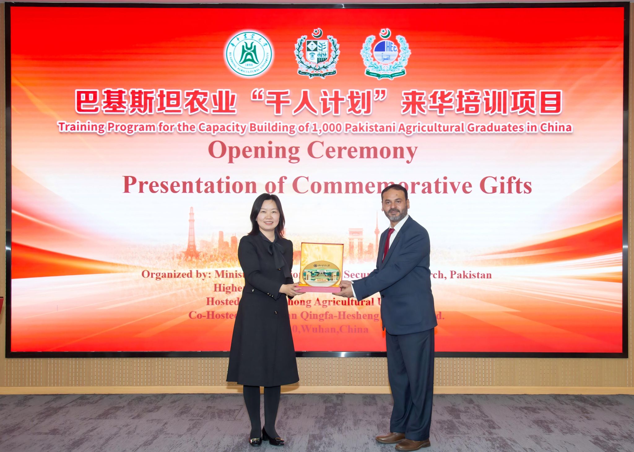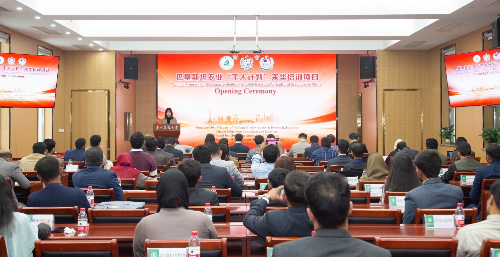 11月10日上午,巴基斯坦农业“千人计划”来华培训项目(第二批)开班典礼在我校教育培训学院顺利举行。巴基斯坦国家粮食安全与研究部副总干事沙夫卡特·阿巴西,学校科学技术发展研究院副院长、教育培训学院院长赵慧,学校国际交流合作部部长曾红霞,武汉庆发禾盛农业发展有限公司总经理朱晓波等领导出席开班典礼。54名巴基斯坦来华培训学员现场参加活动。