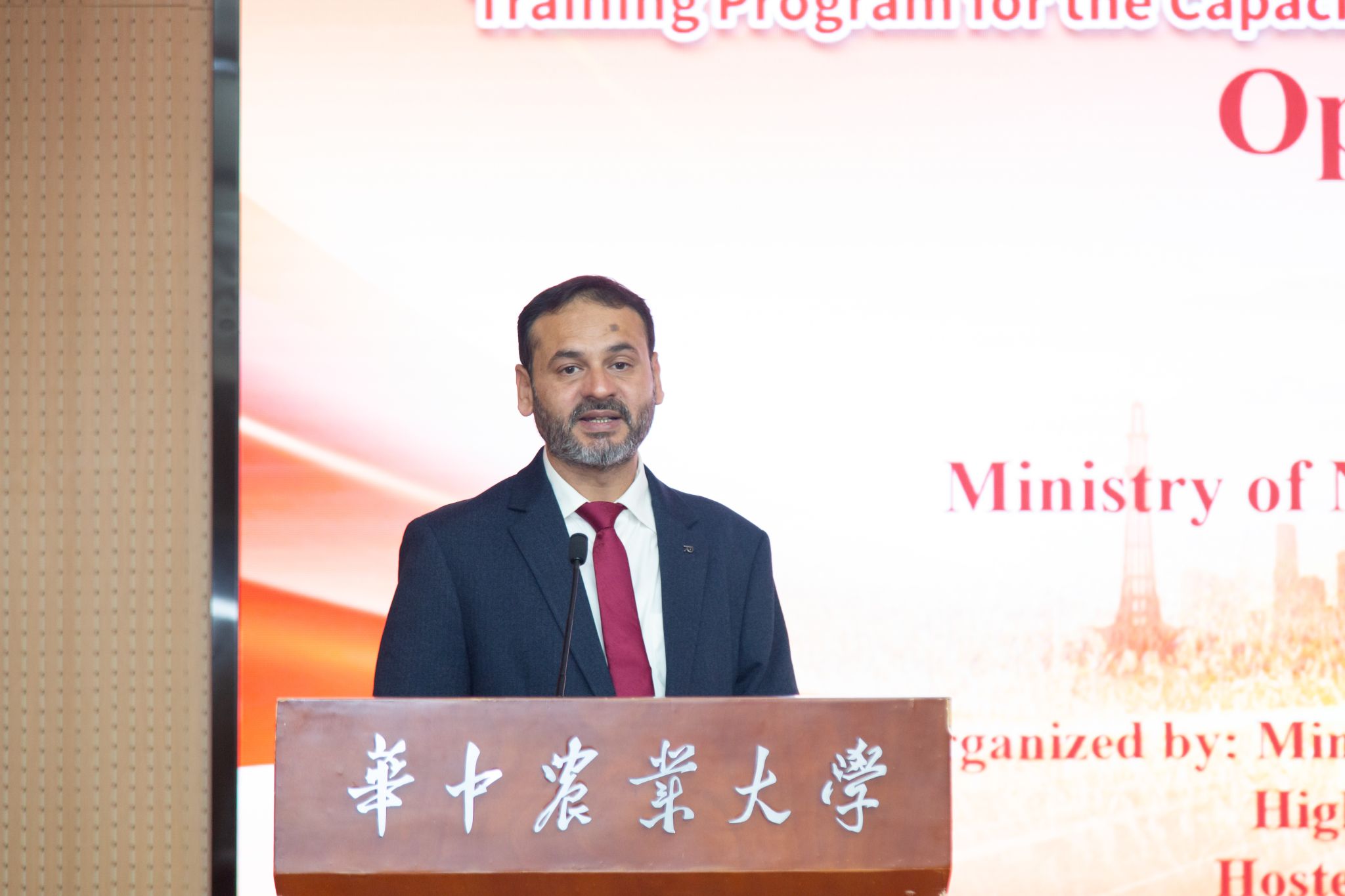 沙夫卡特·阿巴西代表巴基斯坦政府国家粮食安全与研究部(MNFSR)致辞。他向学校致以最诚挚的祝贺和崇高的敬意,并表示巴基斯坦农业“千人计划”来华培训项目具有重要意义和作用。种子产业是巴基斯坦政府的重中之重,期望能通过在华中农业大学的实践操作与实用培训,强化种子领域的人才能力建设。也期待通过培训项目,进一步丰富与深化同华中农业大学、中国政府的合作关系。