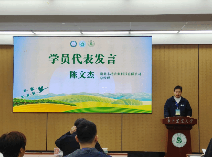 来自湖北仙桃丰功农业科技有限公司的陈文杰作为学员代表发言,他分享了自己跨界投身水产行业的初心与感悟。这位拥有十四年互联网营销经验的“新农人”坦言,从北京返乡做吊水鱼项目的经历,让他深刻体会到“把知识用在乡土大地上的温度”。他表示,传统水产行业的转型升级亟需“技术+市场”的融合创新,愿在培训中主动分享电商运营心得,也期待向行业前辈请教养殖技术,与同学们凝聚“雁阵”力量,让“楚字号”水产走进更多家庭。