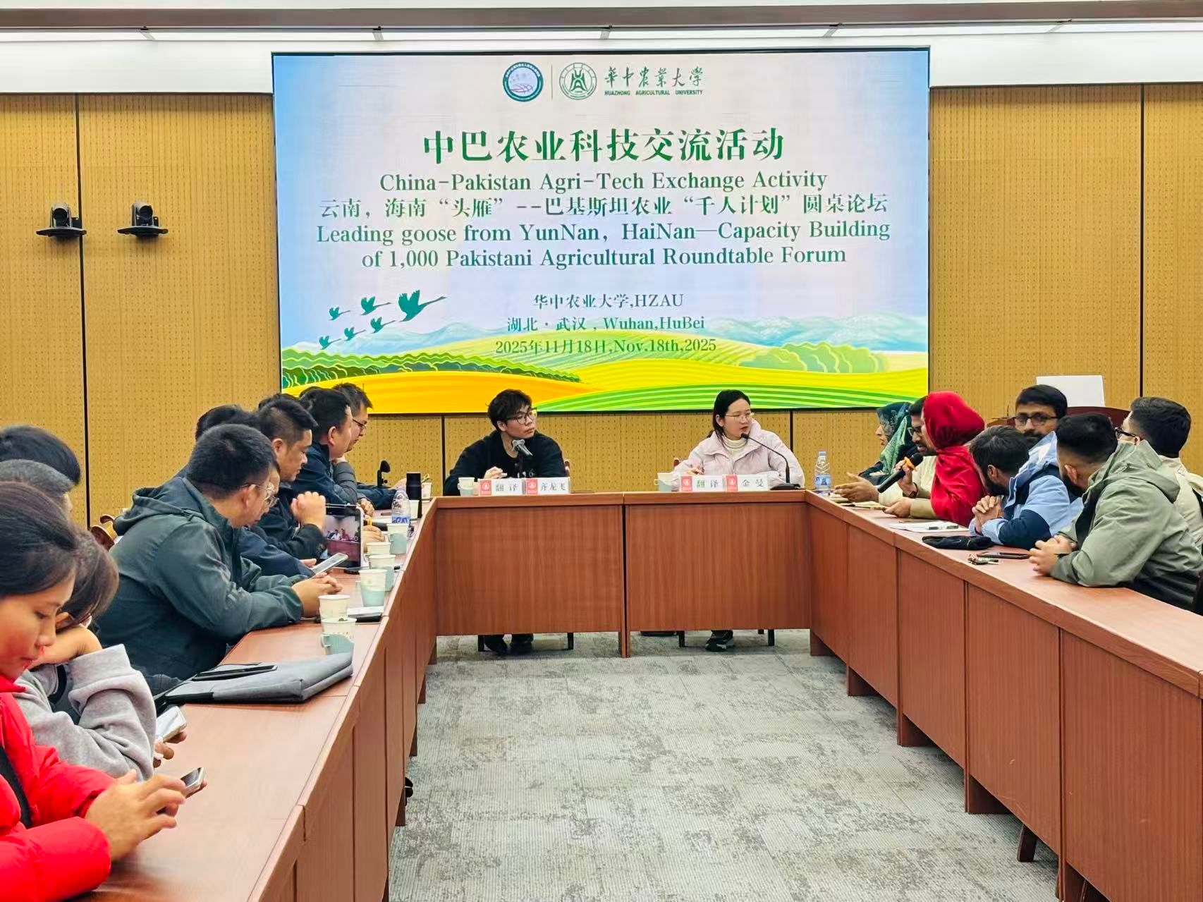 来自云南与海南的“头雁”学员代表周熙童、马晓稳、李云贵、李俊达、林特宇等参与交流,他们分别从事柑橘、茶叶、车厘子等农业产业,不仅带来了一线技术经验,还带来了新鲜的农产品;而巴基斯坦学员主要为园艺领域的科研人员,研究方向涵盖柑橘、车厘子、芒果等多种水果,期待着能了解更多中国农业现状。与会学员围绕水果、茶叶等农业议题展开友好交流,学校外国语学院翻译专业学生金曼和齐龙飞现场协助双方交流。
