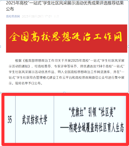 此次评选活动由教育部思想政治工作司主办、全国高校思政网承办,于2025年3月启动,旨在树立高校学生社区综合管理模式创新典范,彰显育人实效,引领带动全国高校“一站式”学生社区全员覆盖、精准覆盖和高质量发展,并为其他高校提供可学习、可参考、可借鉴的建设经验。
