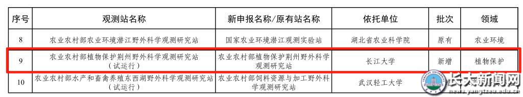 新闻网讯 近日,由我校牵头申报的“农业农村部植物保护荆州野外科学观测研究站”正式获批立项建设。该站是我校首个农业农村部野外科学观测研究站,也是湖北省高校首批获准建设的同类科研平台之一。