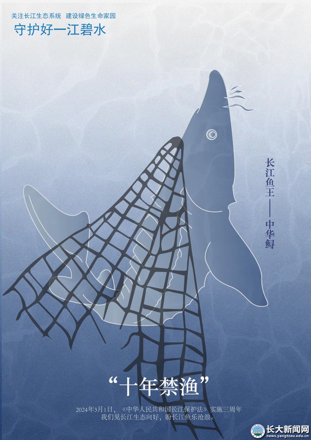 该作品由长江大学继续教育学院马克思主义学院学生王悦悦精心创作。画面以 “长江鱼王” 中华鲟奋力挣脱渔网的动态场景为核心,巧妙呼应《中华人民共和国长江保护法》实施三周年的重要节点。作品通过简洁有力的视觉语言,生动传递出 “守护一江碧水” 的生态使命,不仅展现了对长江生态持续向好的殷切期盼,更以 “人与自然和谐共生” 的主题引发广泛共鸣,充分彰显了长江大学继续教育学院青年学子以创意赋能生态保护、用行动践行社会责任的时代担当。