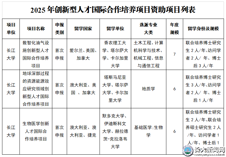 新闻网讯 近日,国家留学基金管理委员会公布2025年创新型人才国际合作培养项目立项结果。长江大学顶格申报的3个项目全部获批,申报的选派专业和规模悉数通过,获批率达100%。长江大学继续教育学院作为学校人才培养体系的重要组成部分,其优秀教师及学员未来也将有机会受益于此项目平台。这是我校连续三年获批国家级创新项目,年度新增获批数量居全国第一梯队,新增项目数和当前执行项目总数均为省属高校第一。至此,我校实现了国家级创新项目在理工农医学科领域的全覆盖。