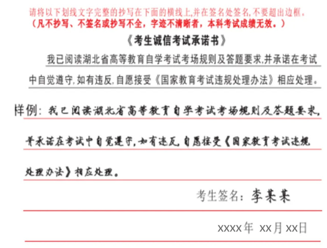 6.落实笔迹信息采集要求。考生应在答题卡指定区域完整抄写《考生诚信考试承诺书》,凡不抄写、不签名、不填写日期或抄写不全,字迹不清晰者,该科考试成绩无效。考生毕业时,省教育考试院将对每张答题卡上的《考生诚信考试承诺书》笔迹进行复核,凡笔迹不一致、经鉴定为代考的,将根据《国家教育考试违规处理办法》作出成绩作废、延迟毕业、记入国家教育考试诚信档案等处理。《考生诚信考试承诺书》抄写样例如下图: