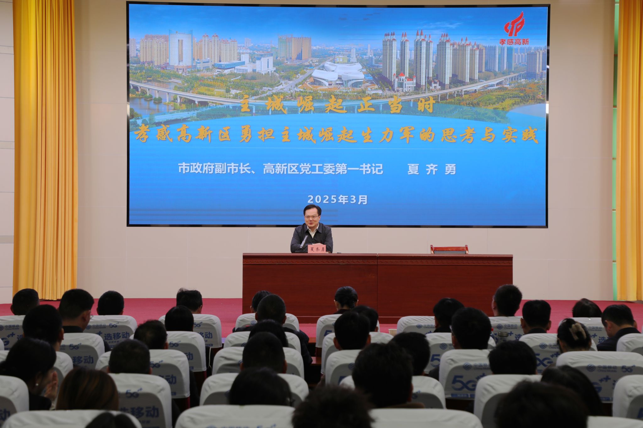 夏齐勇作了题为“主城崛起正当时——孝感高新区勇担主城崛起生力军的思考与实践”报告。报告从“主城崛起是值得孝感市民期待的战略、高新区是主城崛起的主战场、湖北工程学院是主城崛起的重要宝藏、我们都是主城崛起的主人翁”四个方面,生动阐述了孝感高新区勇担主城崛起生力军的深刻内涵。夏齐勇表示,孝感主城的舞台已璀璨点亮,有等待破茧的产业命题,更有千年澴川孕育的无限可能。他强调,孝感高新区将从“创新政策、创新平台、创新氛围和创新服务”四个方面统筹发力,打造国内外一流创新生态,着力解决好科技创新与产业创新所需的“阳光、土壤、空气和水分”问题,为大家干事创业提供一流的服务、一流的环境、一流的平台。他诚邀湖工师生加入到孝感主城崛起大战略,成为主城崛起的一份子,与孝感的崛起同频共振,为主城崛起贡献科技力量。