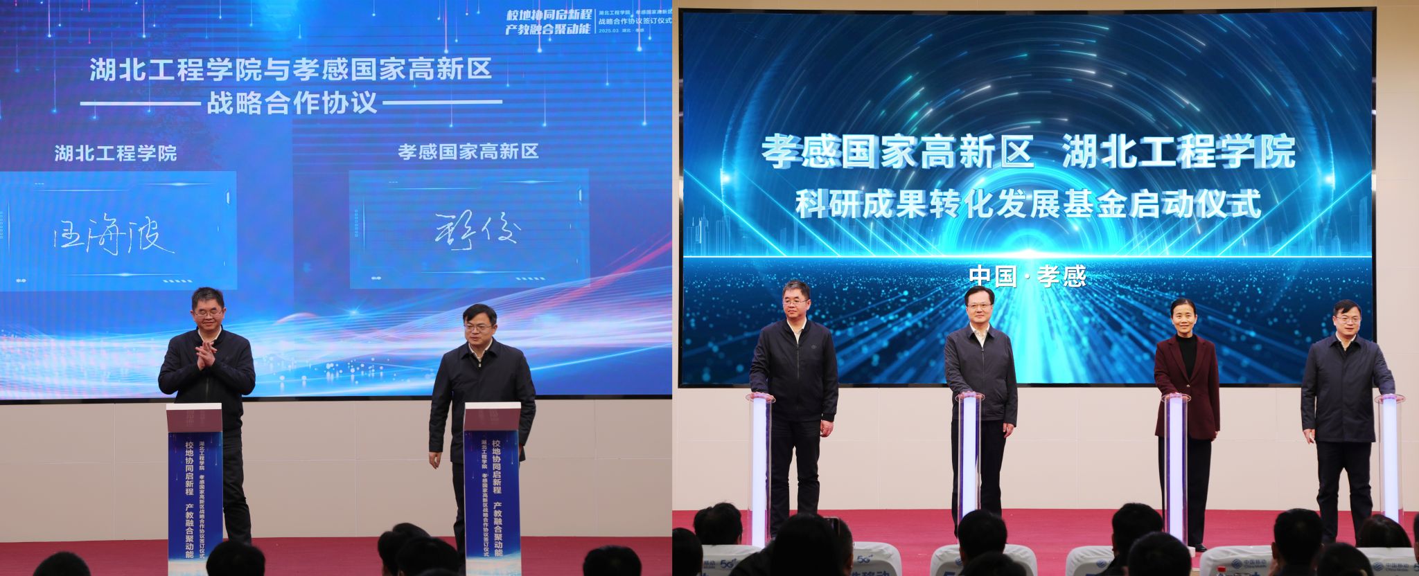 校长汪海波与孝感高新区管委会主任舒俊共同签订校地双方战略合作协议。夏齐勇、卢雪梅、汪海波、舒俊一起按下“孝感国家高新区·湖北工程学院科研成果转化发展基金”启动键。