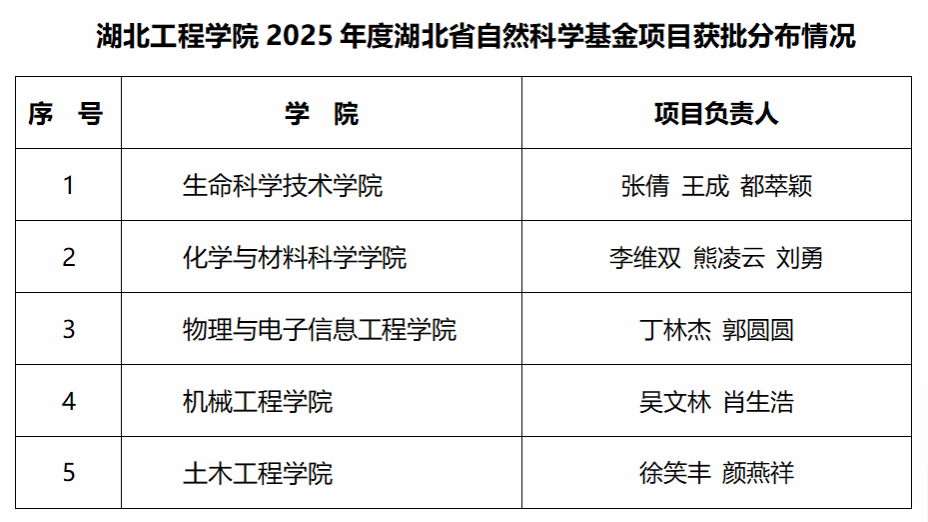 近日,湖北省科技厅公布了《省科技厅关于下达2025年省自然科学基金计划项目的通知》(鄂科技发资〔2025〕3号),我校12位教师申报项目成功获批立项,其中面上项目4项,青年项目4项,指导性项目4项,项目资助经费总额达80万元,实现持续增长。