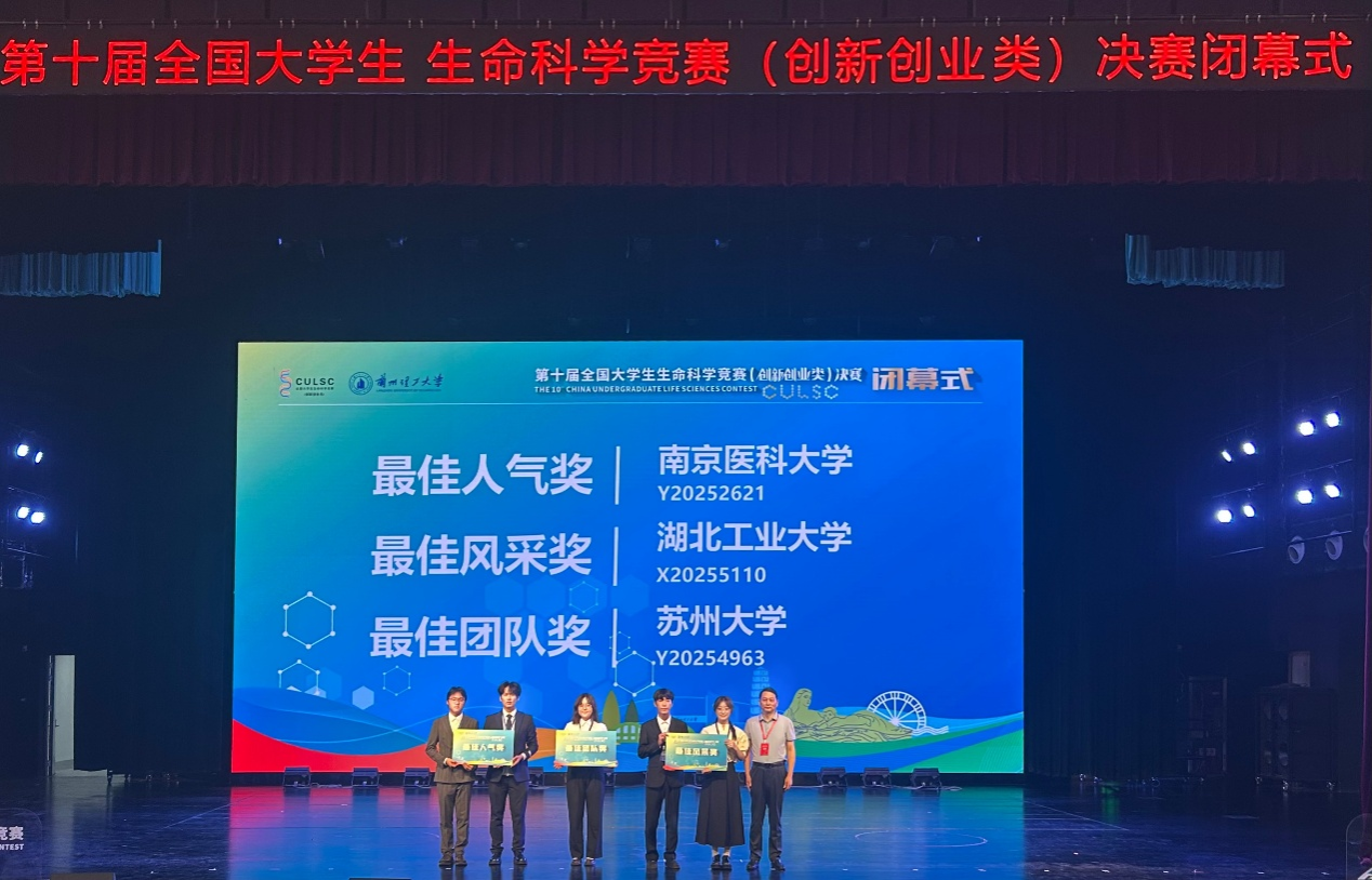 作为国内生命科学领域极具影响力的学科竞赛,本届生科赛(创新创业类)赛道吸引来自全国590所高校的7458支队伍参与角逐,共产生一等奖288项,二等奖979项,三等奖1348项。作为我校唯一晋级决赛的队伍,吴茜教授所带领的“好运莲莲”团队与来自210所高校的518支劲旅同台竞技,最终凭借卓越的创新能力与紧密的团队协作脱颖而出,荣获全国一等奖,并作为6支优秀代表团队之一在闭幕式上路演展示,成功斩获“最佳风采奖”单项荣誉。这是我校首次登上此项赛事的路演舞台,充分展现了湖工大学子的过硬素质与良好风貌。