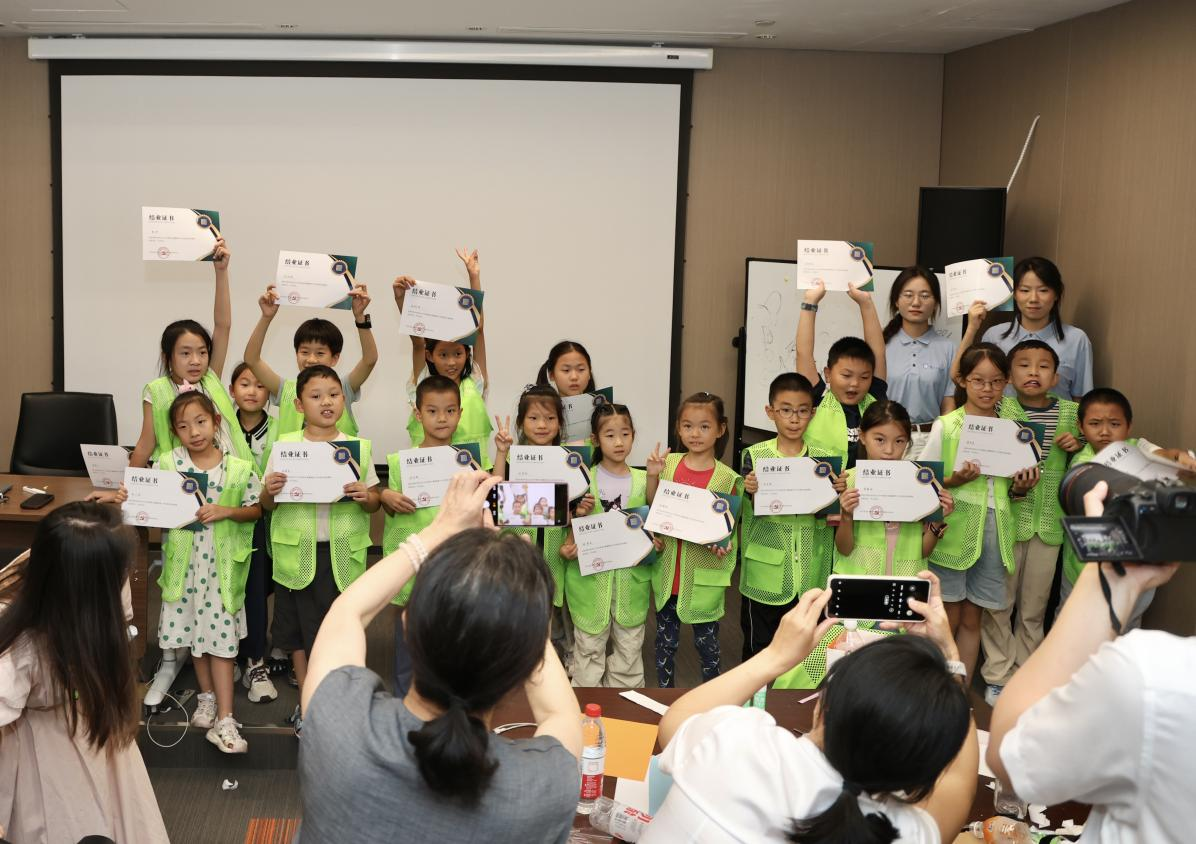 实践课程结束后,工作人员和志愿者们共同为小朋友颁发结业证书。据悉,土木建筑与环境学院“筑梦”青协实践队自7月起,多次深入参加匠心城青少年空间、广八路等社区的暑期托管班活动,精心设置了变废为宝、绿色长江大保护等特色课程,让孩子们在快乐学习中树立环保低碳理念。
