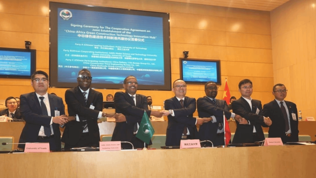湖北工业大学、亚的斯亚贝巴科技大学、季马大学、文达大学、中铁十一局、中建三局、葛洲坝集团现场签署《中非绿色建造技术创新港共建协议》,“产学研用”一体化推进,打造从技术创新到工程应用的中非绿色建造全链条合作新范式。