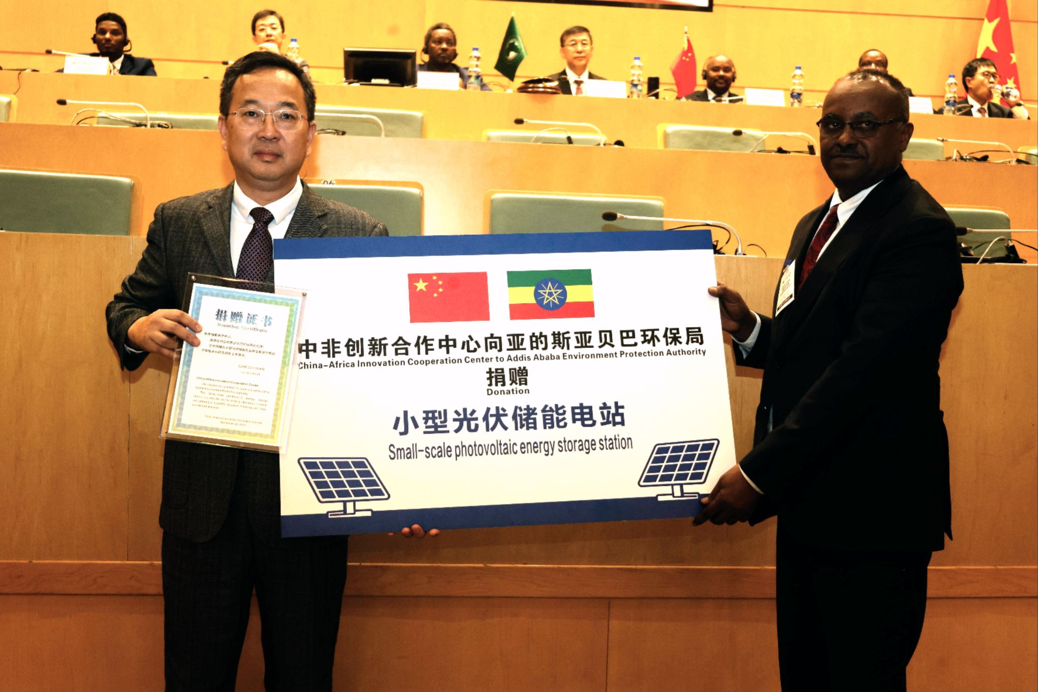 开幕式上,中非创新合作中心向亚的斯亚贝巴环保局捐赠小型太阳能光伏储能电站,该项目由我校曾炜教授团队与晶科能源在亚的斯亚贝巴合作建造。