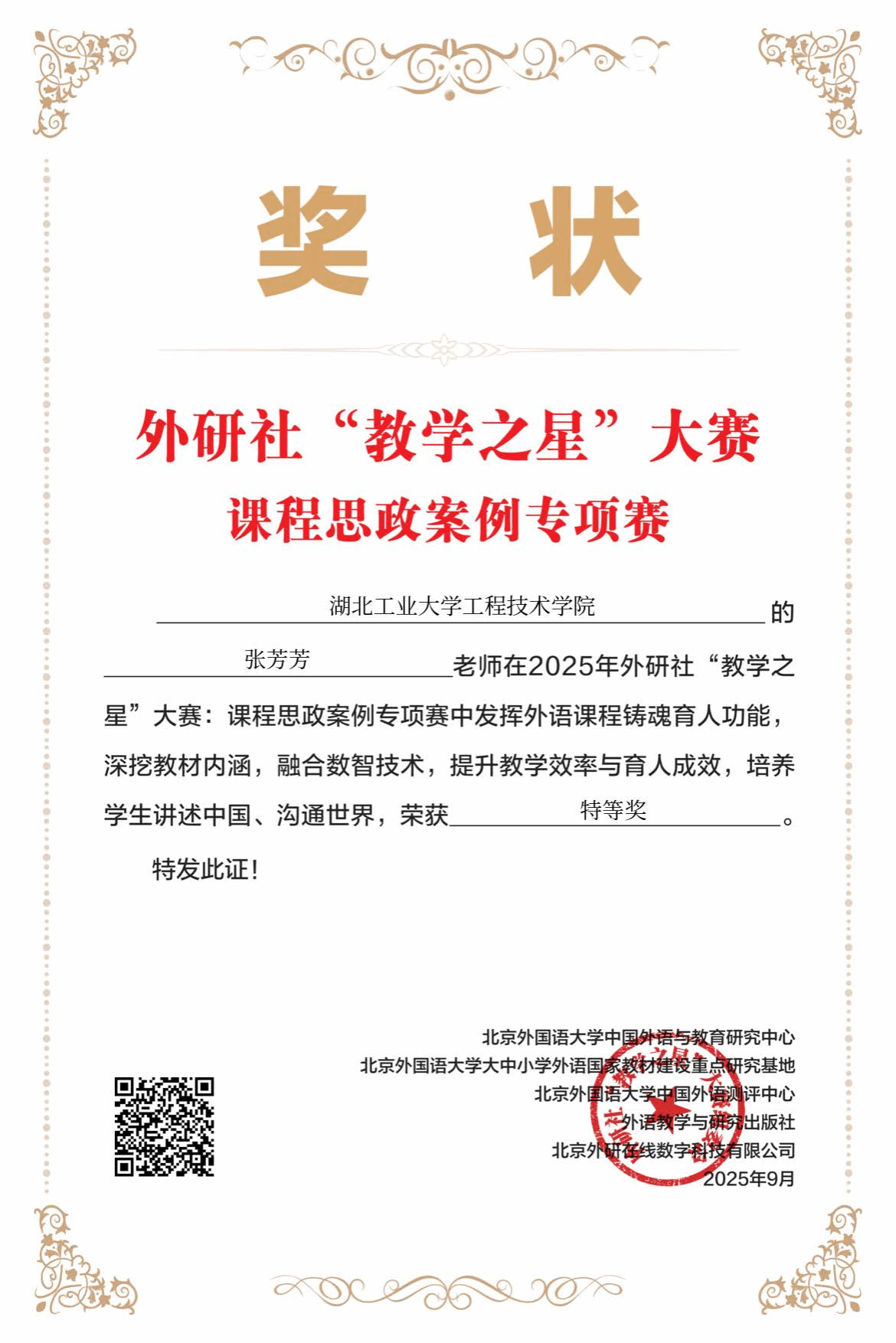 近日,外研社“教学之星”大赛-课程思政案例专项赛结果正式公布。工程技术学院外国语系教师张芳芳提交的思政案例荣获全国特等奖。此外,学院还获得一等奖2项、二等奖1项、三等奖5项的好成绩。