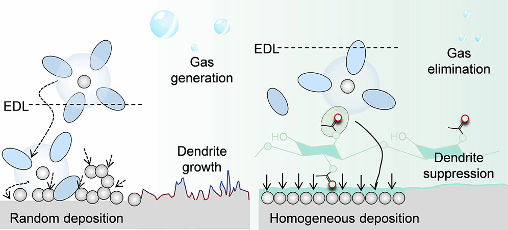钠金属电池因其高自然丰度、低成本和高能量密度备受关注。然而,传统电解液中非均匀的Na⁺通量与缓慢去溶剂化动力学往往导致枝晶生长和副反应,严重制约其实际应用。钠金属负极表面的双电层区域是离子传输和去溶剂化过程发生的重要区域,因此可以通过调控双电层能实现枝晶生长的抑制。尽管电解液添加剂是一种可扩展的稳定化策略,但传统添加剂如氟代碳酸乙烯酯(FEC)存在成本高、碳排放大及毒性等问题。相比之下,来源广泛、绿色可再生的生物质基添加剂具有来源广泛、低成本且碳足迹更小等优势,但相关研究目前较为有限。针对这一问题,团队提出了一种醋酸纤维素(CLA)生物质大分子添加剂,实现了对双电层的有效调控,显著提升钠金属电池的稳定性与寿命。CLA大分子在电双层中优先吸附于钠金属负极表面,取代活泼溶剂化结构中的溶剂分子,抑制界面副反应。同时,其丰富的醋酸根与Na⁺发生竞争性配位,均匀化离子分布并加速去溶剂化动力学。该协同效应有效降低了成核过电位,将Na沉积转变为三维瞬时成核模式,实现枝晶生长与界面副反应的抑制。最终,Na||Na对称电池在0.5 mA cm⁻²电流密度下稳定循环超过7000小时(约292天);同时,在NVP||Na电池中实现了2000圈高倍率(5C)循环后仍保持约80.4%的容量,显著优于传统电解液及多数报道的添加剂体系。