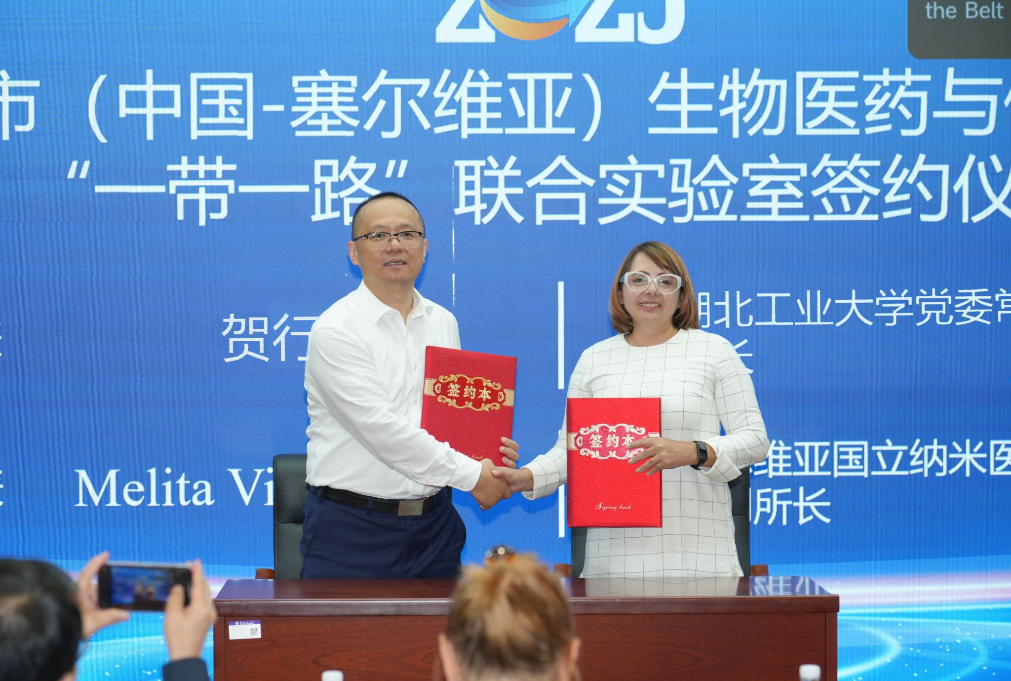 当天下午,专家学者围绕生命科学、纳米医学、食品安全、表观遗传与视觉神经疾病等前沿议题展开高水平的学术交流。贺行洋代表学校致欢迎辞。在签约仪式上,湖北工业大学与塞尔维亚国立生物研究所正式签署共建“一带一路”联合实验室合作协议,标志着双方合作进入机制化、常态化、实质化的新阶段,为未来在生物医药、分子科学与健康工程等领域的深度合作奠定了坚实基础。现场,塞尔维亚贝尔格莱德大学纳米研究所所长、尼古拉·特斯拉金奖章获得者道乐·科路伽教授还将其专著《Qi Engineering》赠予学校,象征中塞两国在科技与文化层面的深厚友谊。贺行洋代表学校回赠纪念品,以表诚挚谢意。