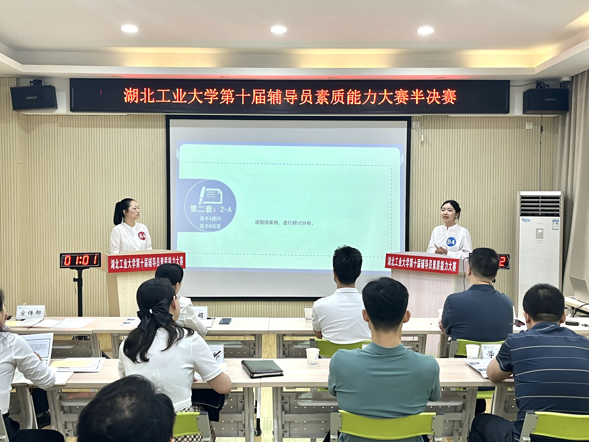 半决赛环节采用案例研讨方式进行,参赛选手现场抽取AB角色签位,以“我提问,你回答”的形式围绕辅导员工作案例共同辨析原因、研讨对策、总结规律。主要考察辅导员综合运用理论分析问题、研判问题、解决问题的能力。