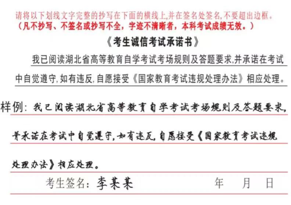 考生应在答题卡指定区域完整抄写《考生诚信考试承诺书》(抄写样例如下图),凡不抄写、不签名或抄写不全,字迹不清晰者,该科考试成绩无效。凡笔迹不一致、经鉴定为代考的,将根据《国家教育考试违规处理办法》作出成绩作废、延迟毕业、记入国家教育考试诚信档案等处理。