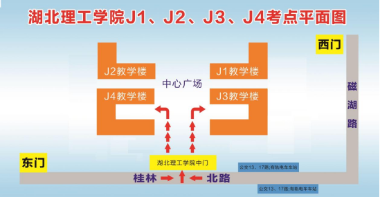 所有考生只能从我校中门入校。除考生本人外,送考及陪考人员一律不得入校。因赴考人数较多、周边道路交通和天气变化等状况复杂,建议考生提前70分钟到达考点准备,主动配合和服从管理。为了便于大家查找,请各位考生导航时务必选择“湖北理工学院(中门)”。