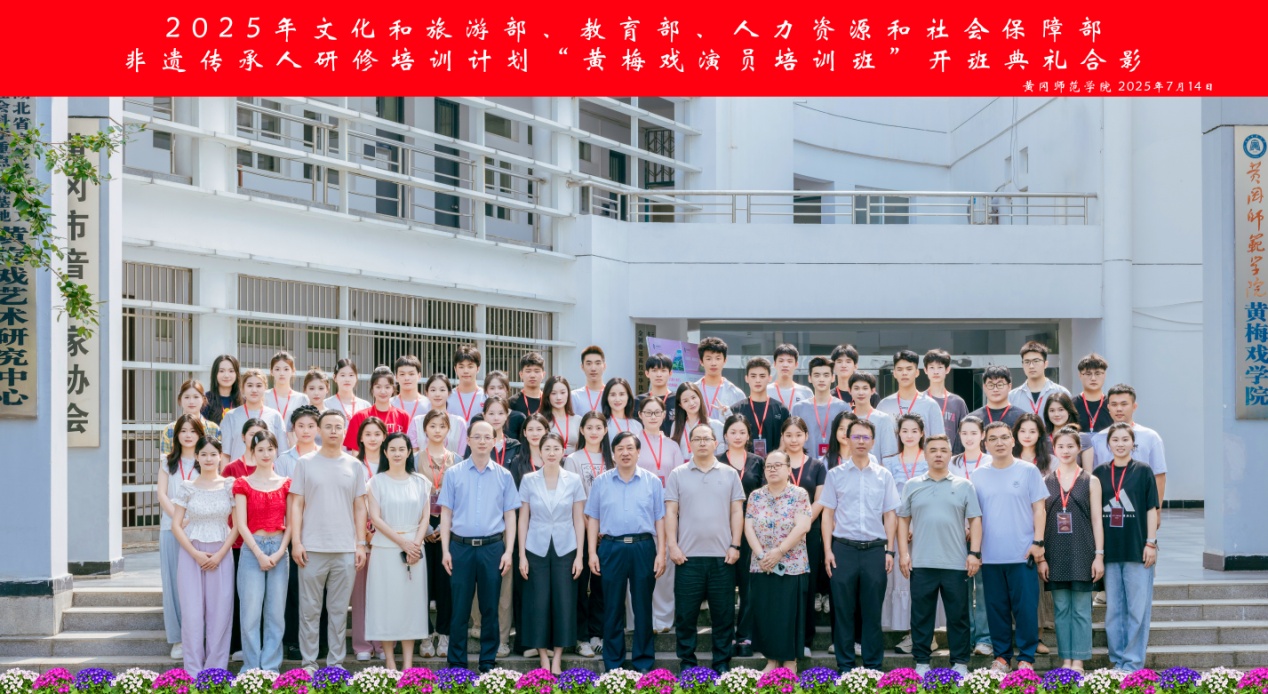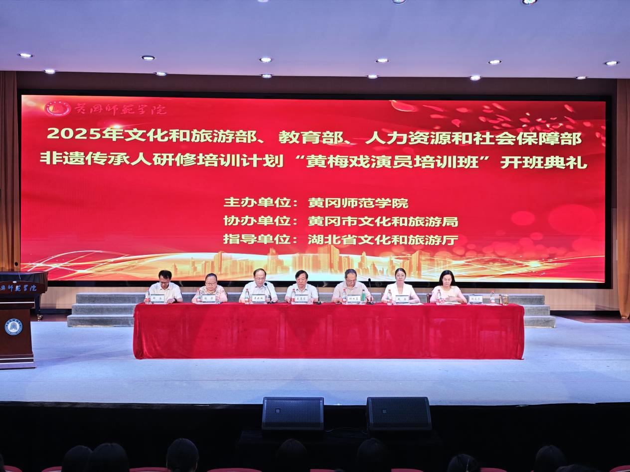 本网讯 7月14日,由湖北省文化和旅游厅指导、黄冈市文化和旅游局协办、黄冈师范学院继续教育学院具体承办的2025年文旅部、教育部、人社部非遗传承人群研修研习项目——“黄梅戏演员培训班”开班仪式在黄冈师范学院音乐厅隆重举行。湖北省文旅厅非遗处副处长胡双喜,校党委副书记王基家,黄冈市文旅局副局长段晶等领导出席。黄冈师范学院继续教育学院充分发挥学校学科优势,精心组织本次国家级非遗传承人群培训项目。