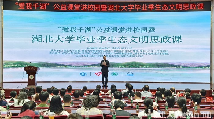 新闻网讯 2025年“爱我千湖”公益课堂进校园暨湖北大学毕业季生态文明思政课在湖北大学会议中心思睿厅举行。省水利事业发展中心主任姜俊涛、团省委副书记徐本禹、校党委副书记李莉出席活动,湖北大学继续教育学院作为联合主办方之一,深度参与活动策划与执行,为推动生态文明教育融入终身学习体系贡献力量。
