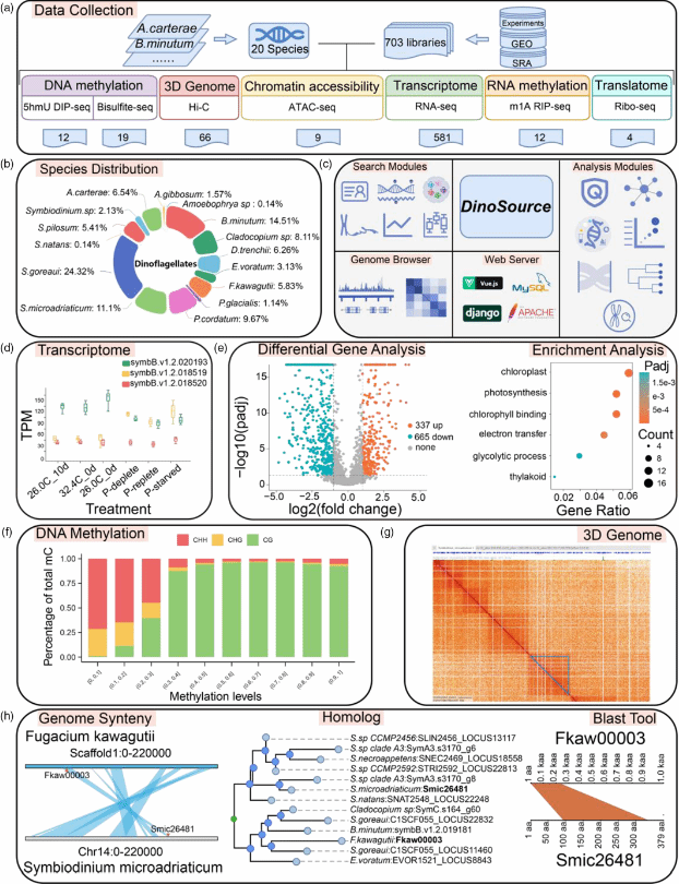 该研究工作整合了来自20种甲藻物种的参考基因组和基因组注释数据,以及 703个多组学数据集,涉及表观基因组数据(如 DIP-seq、BS-seq、ATAC-seq、RIP-seq)、染色质构象数据(Hi-C)、转录组数据(RNA-seq)和翻译组数据(Ribo-seq)。每项数据均依照标准化分析流程进行处理,包括质量控制、比对至相应的甲藻参考基因组,以及在数据库网页界面上的结果可视化。多组学信号的可视化通过 WashU Epigenome Browser 实现,而三维基因组数据的高级可视化则借助 HiGlass 平台完成。