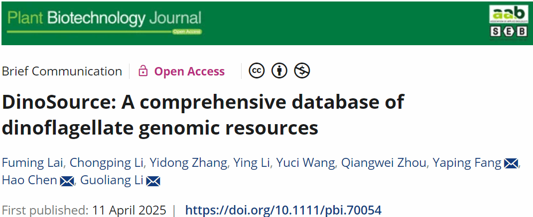 近日,华中农业大学李国亮团队联合南方科技大学陈浩团队,共同在Plant Biotechnology Journal 杂志上发表题为DinoSource: a comprehensive database of dinoflagellate genomic resources的最新研究进展。该研究成功构建了全球首个甲藻综合数据库DinoSource(http://glab.hzau.edu.cn/dinosource)。