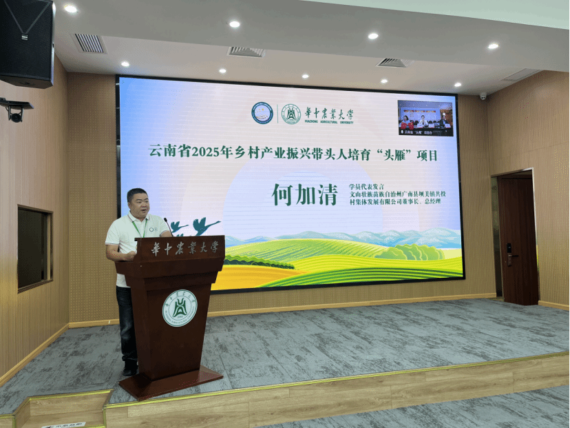 赵慧对学员们的到来表示热烈欢迎,对云南省农业农村厅和云南省农业广播电视学校长期以来的关心和支持表示感谢。她提出,自2022年启动“头雁”项目以来,华中农业大学已培养7000多名头雁,学校依托自身学科优势,结合学员需求,开展特色培育工作,并搭建交流平台。近两年,在云南省农业农村厅和云南省农业广播电视学校的指导下,学校很好地实施了“头雁”项目,达成了多个合作意向,在科技创新、品牌建设、技术指导方面深化产学研合作,共同探索更多科研与实践的结合点。今年,学校将继续承担260名云南“头雁”的培育任务,她就高质量实施好云南头雁培育做了三点表态:一是坚持搭建平台,提升培育引领力;二是精准配备导师,注入产业振兴新引擎;三是全链条开展长效服务,提升产业支撑力。通过搭建平台、精准配备导师、开展长效服务,推动“头雁”展翅高飞,促进产业振兴。最后,赵院长鼓励学员们珍惜学习机会,努力学习,为农业现代化发展、乡村产业振兴注入新鲜力量。