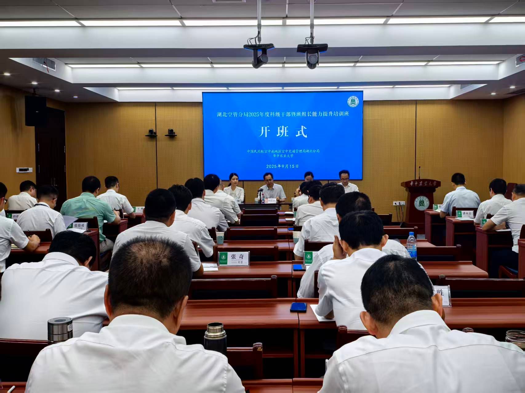 阎岳志作培训动员讲话。他首先对学校周密细致的培训组织工作表示感谢,强调华中农大作为人才培养的重要基地,积淀了深厚的学术底蕴与浓郁的研学氛围。他提到,湖北空管分局与学校已建立起良好的合作基础,双方多次携手开展培训,共同助力民航事业发展。他指出,面对新形势、新任务,空管系统的发展之路机遇与挑战并行。为此,他希望参训学员借助本次培训的机会,在严格遵守纪律的前提下,沉心钻研理论知识、刻苦锤炼专业本领,全面提升自身素质和能力,提高战略思维,不断开拓空管事业的未来。