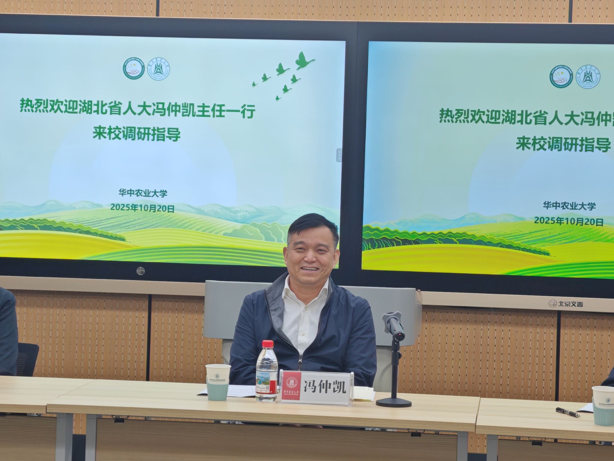 10月20日,湖北省人大常委会委员、农委主任委员冯仲凯,湖北省人大常委会委员、农委副主任委员刘晓洪、邓长青,湖北省农业农村厅二级巡视员陈汉秋,省人大农委办公室、省农业农村厅农村社会事业促进处和科技与人才处等相关单位负责人一行来校就湖北省十大民生项目中的“头雁”项目实施情况进行调研交流。校党委书记姚江林接待了冯仲凯一行并出席座谈会。