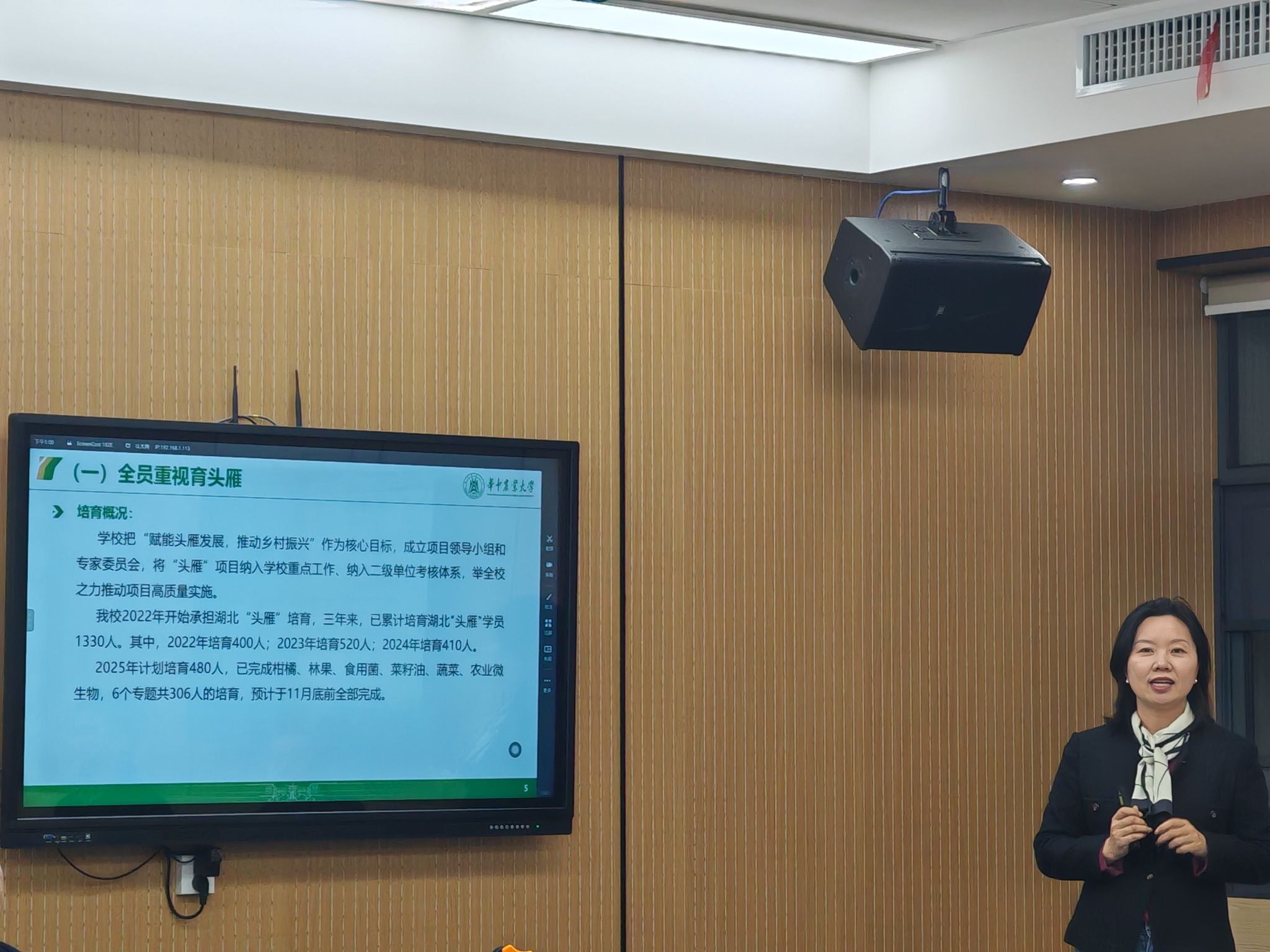 随后,调研组一行听取了华中农业大学教育培训学院院长赵慧就湖北省“头雁”项目实施情况的汇报。赵慧以《培育乡村振兴“领头雁”,谱写强农兴农“新篇章”》为题从培育目标、培育定位、培育过程和培育成效等方面详细介绍了湖北“头雁”培育工作。并重点介绍了学校在平台搭建、选树典型、调查研究等方面的创新做法,学校通过成立“跨区域头雁销售联盟”、开发“头雁学农资源链动生态平台”等,不断以科技赋能“头雁”全面成长。