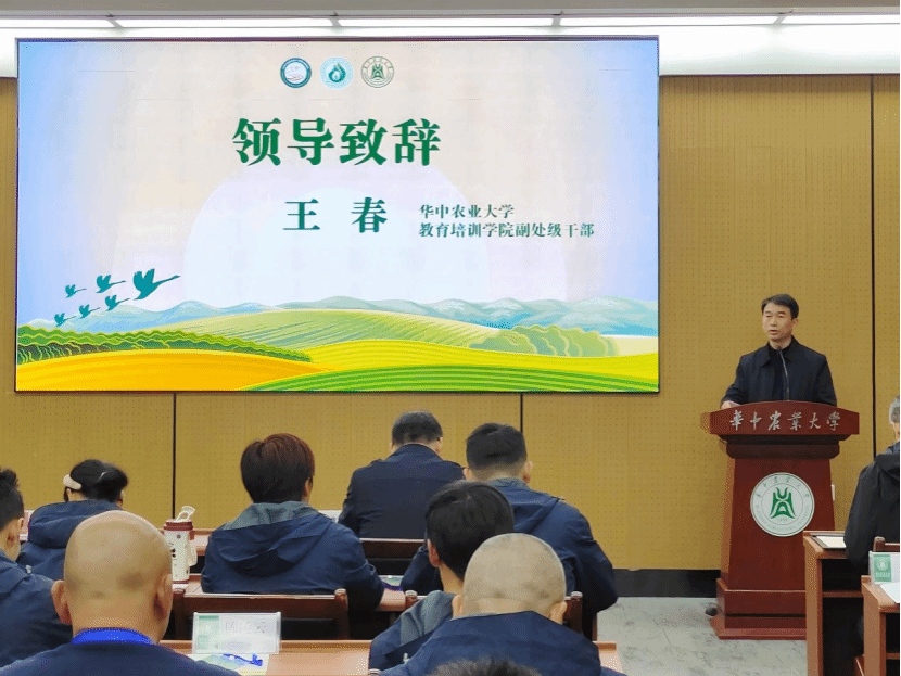 王春在致辞中向全体参训学员表示热烈欢迎,并向长期支持学校发展的省农业农村厅领导致以诚挚感谢。王春提到,湖北作为“千湖之省”,水产产业是乡村振兴的重要支柱。他谈到,华中农业大学作为有127年历史的“双一流”高校,始终与湖北农业发展同频共振,近年来,学校水产学院高泽霞教授团队培育出的无肌间刺鱼、王春芳教授研发的鱼类智能化精准投喂系统等硬核成果,正为水产产业转型提供强大技术支撑。他勉励学员争做“绿色生态的坚守者、品牌赋能的创造者、共同富裕的推动者”,以“头雁”之姿引领产业升级。