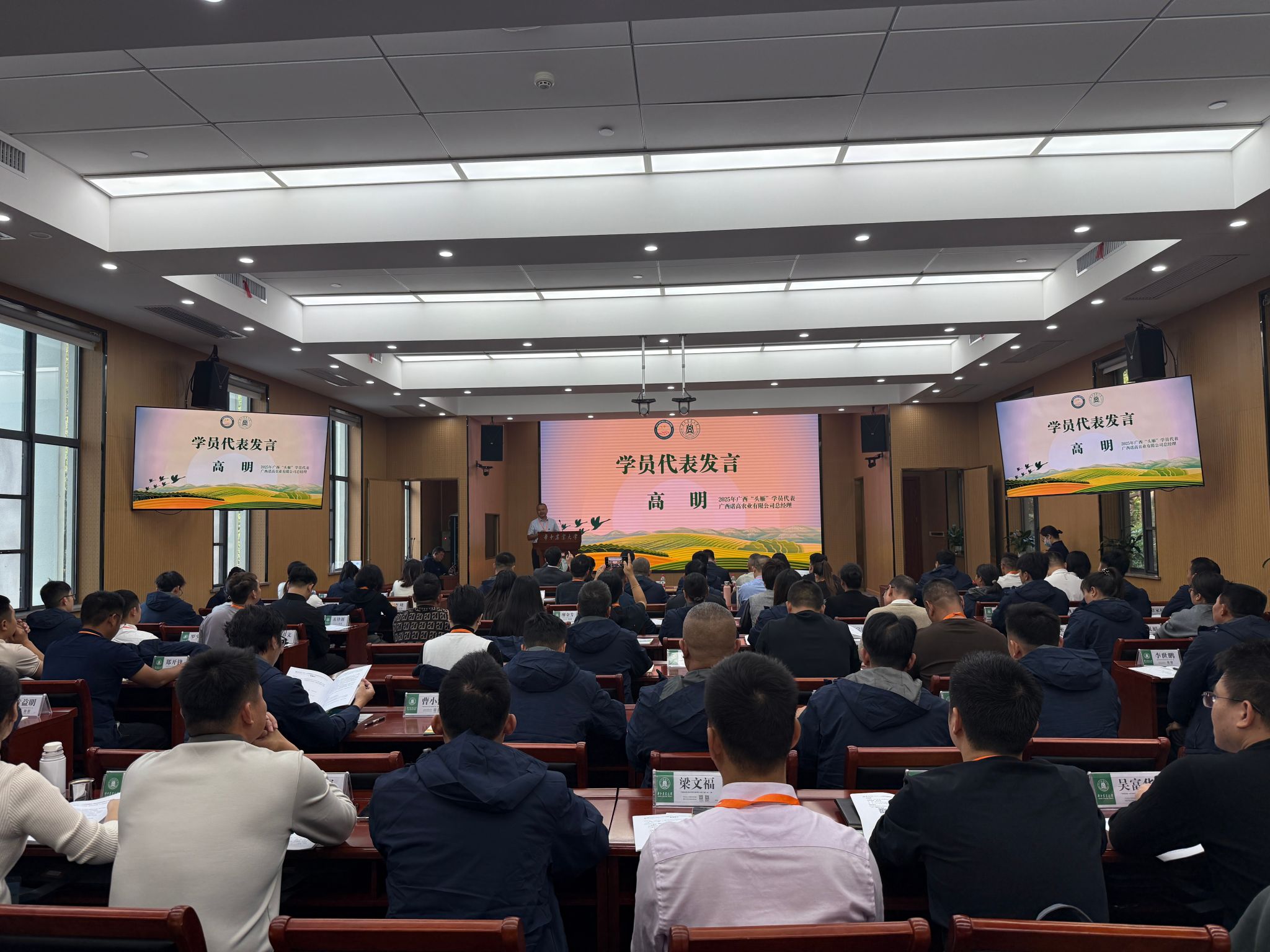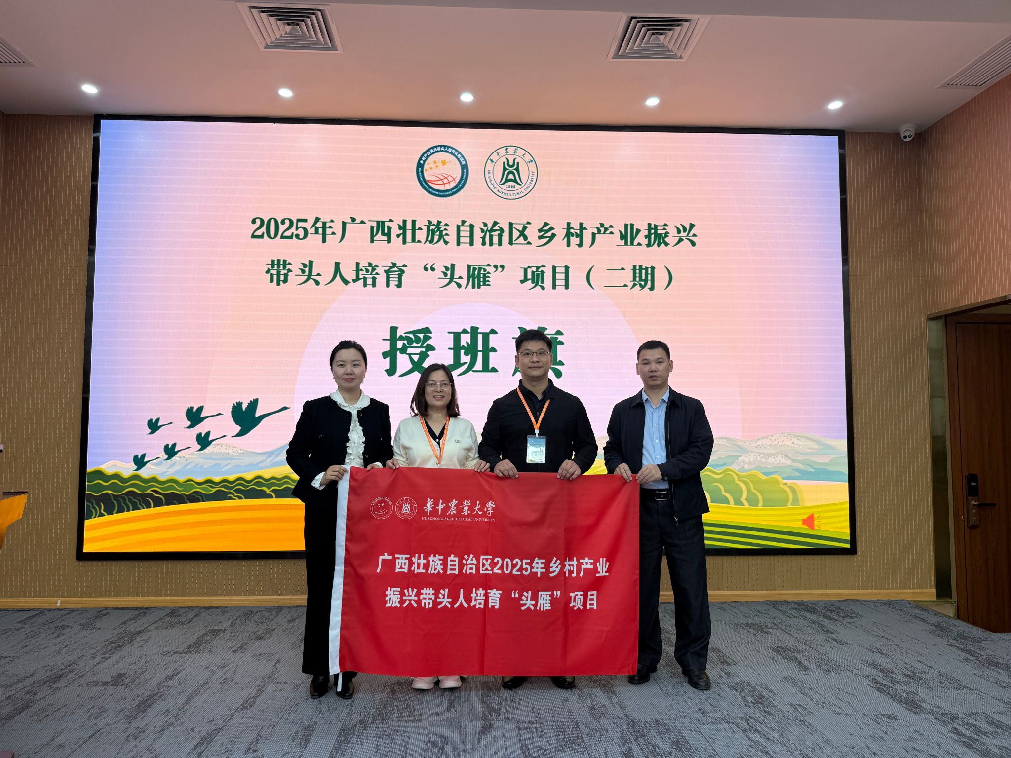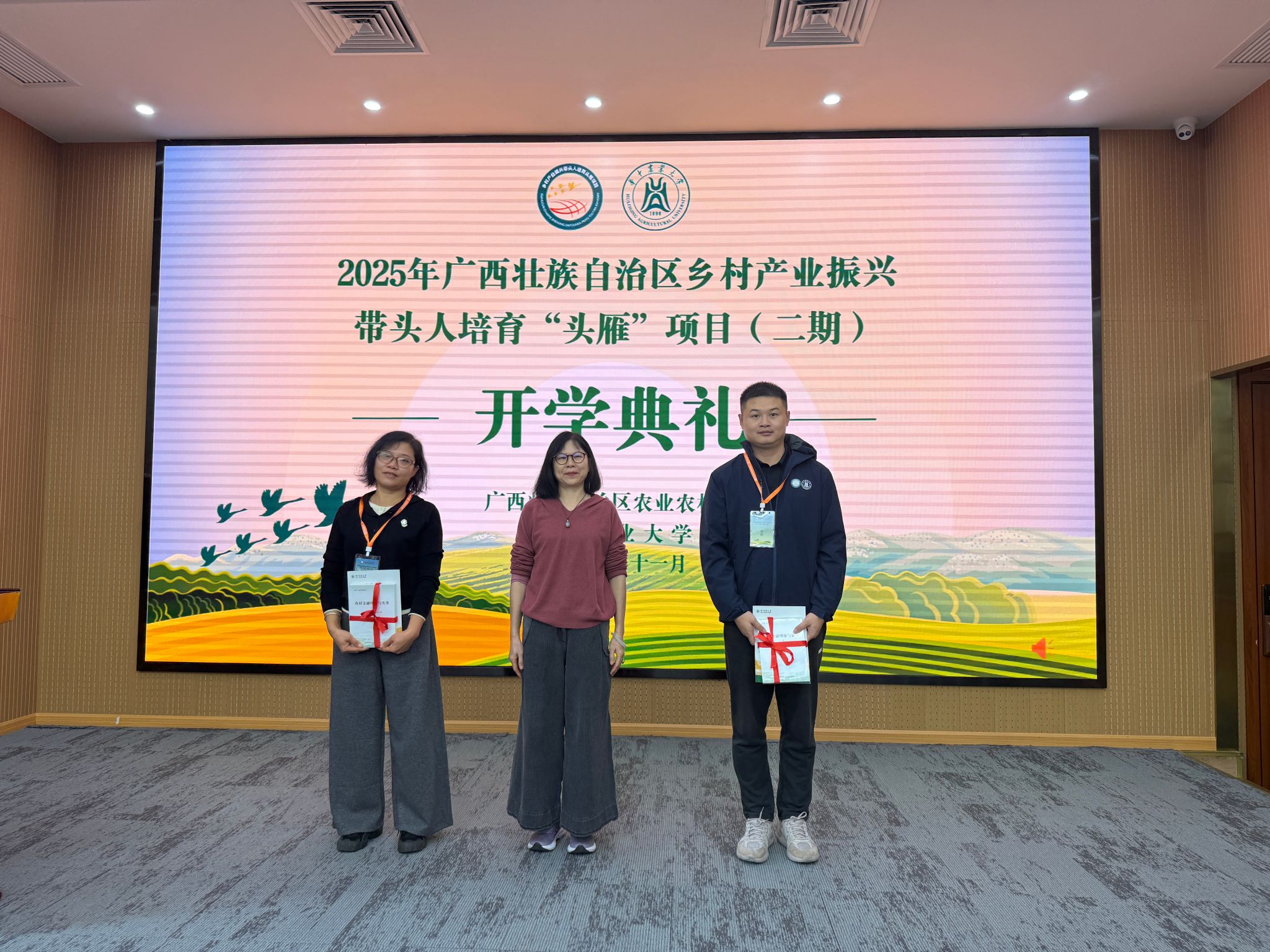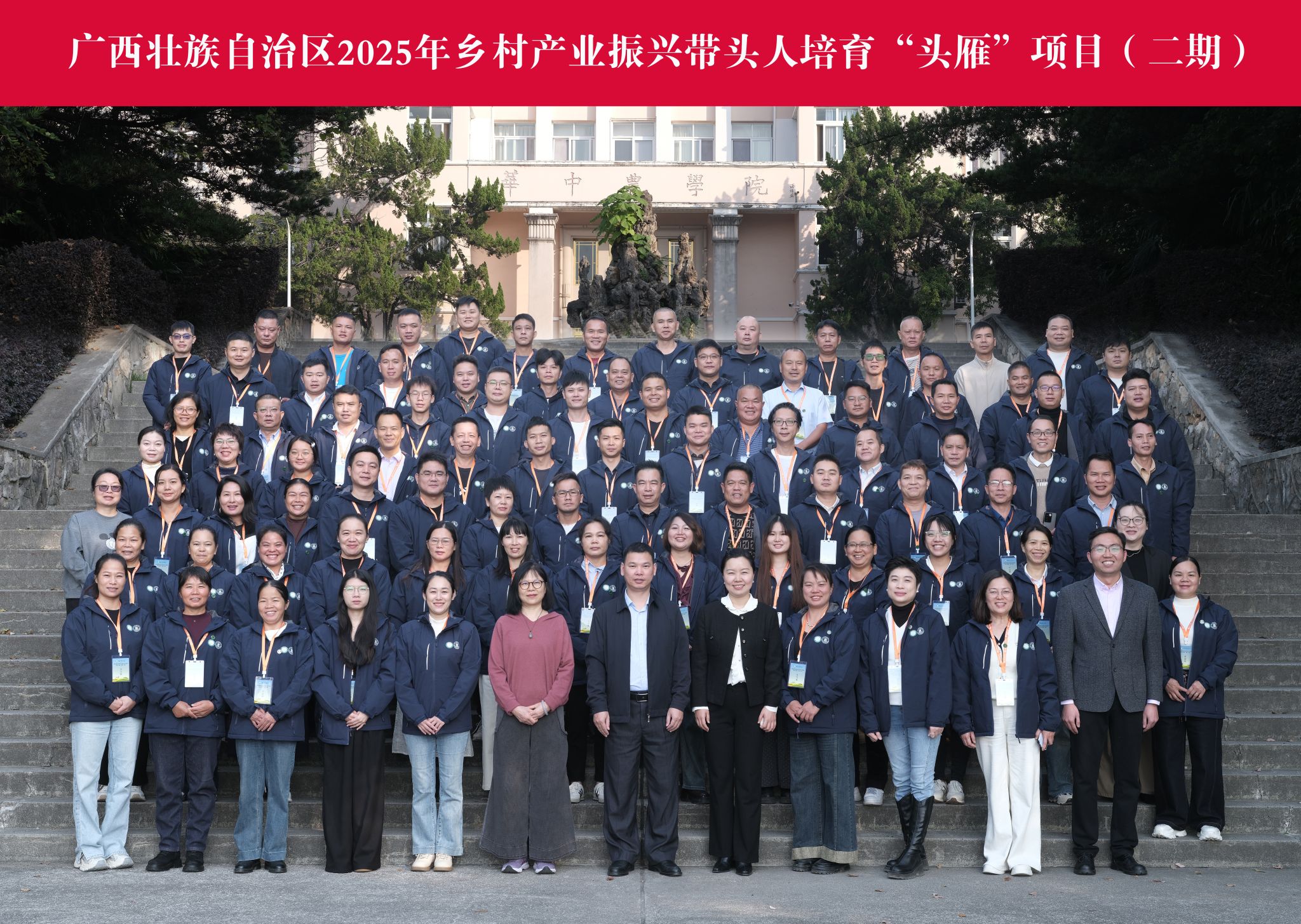 11月15日,广西壮族自治区2025年乡村产业振兴带头人培育“头雁”项目(二期)开学典礼在学校教育培训学院隆重举行。广西壮族自治区农业农村厅人事处副处长文世国、华中农业大学教育培训学院院长赵慧、广西壮族自治区农业干部学校干部陈巧文等嘉宾出席典礼,与来自广西的90名“头雁”学员共同开启新一轮赋能提升之旅。