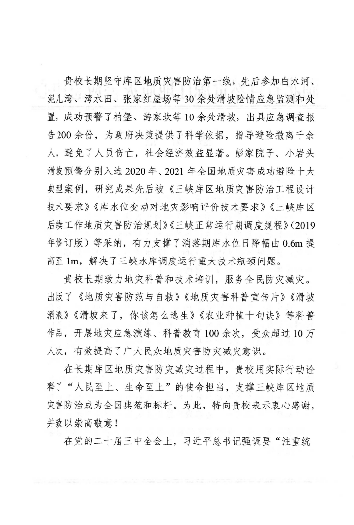 近年来,学校长期坚守库区地质灾害防治第一线,先后参加白水河、泥儿湾、湾水田、张家红屋场等30余处滑坡险情应急监测和处置,成功预警了柏堡、游家坎等10余处滑坡,指导避险撤离千余人,避免了人员伤亡,社会经济效益显著;先后派遣10余位博士、教授到市(县)自然资源主管部门挂职,开展地灾应急演练、科普教育100余次,受众超过10万人次,有效提高了广大民众地质灾害防灾减灾意识,为库区地质灾害防治工作积极贡献专业智慧和力量,用实际行动诠释了“人民至上、生命至上”的使命担当。