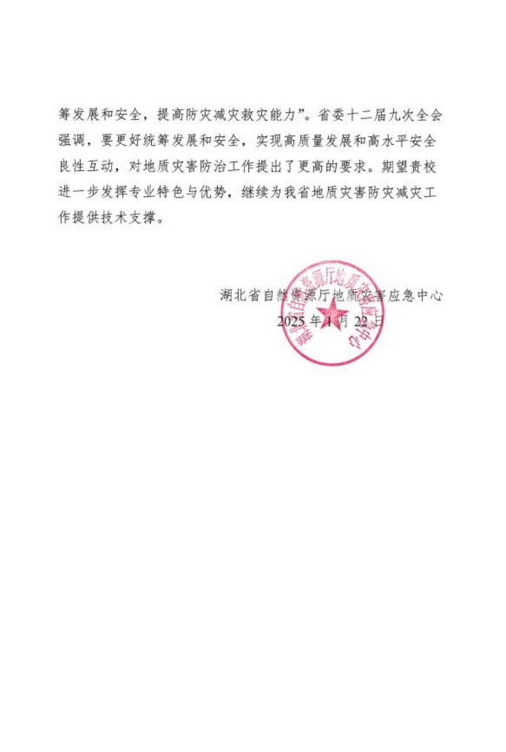 湖北省自然资源厅向我校发来感谢信