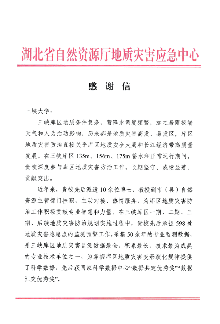 本网讯(通讯员 邓华锋 左清军 刘艺梁 卢书强) 近日,湖北省自然资源厅向我校发来感谢信,对我校在三峡库区135m、156m、175m蓄水和正常运行期间深度参与库区地质灾害防治工作,强力支撑三峡库区地质灾害防治成为全国典范和标杆表示诚挚感谢。