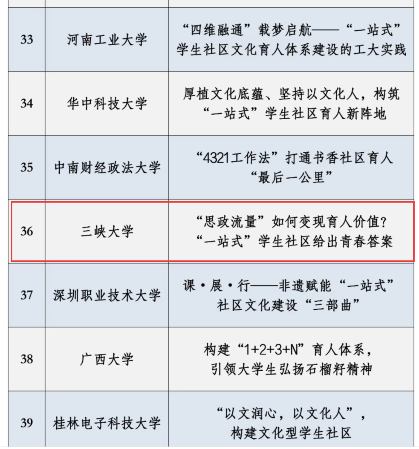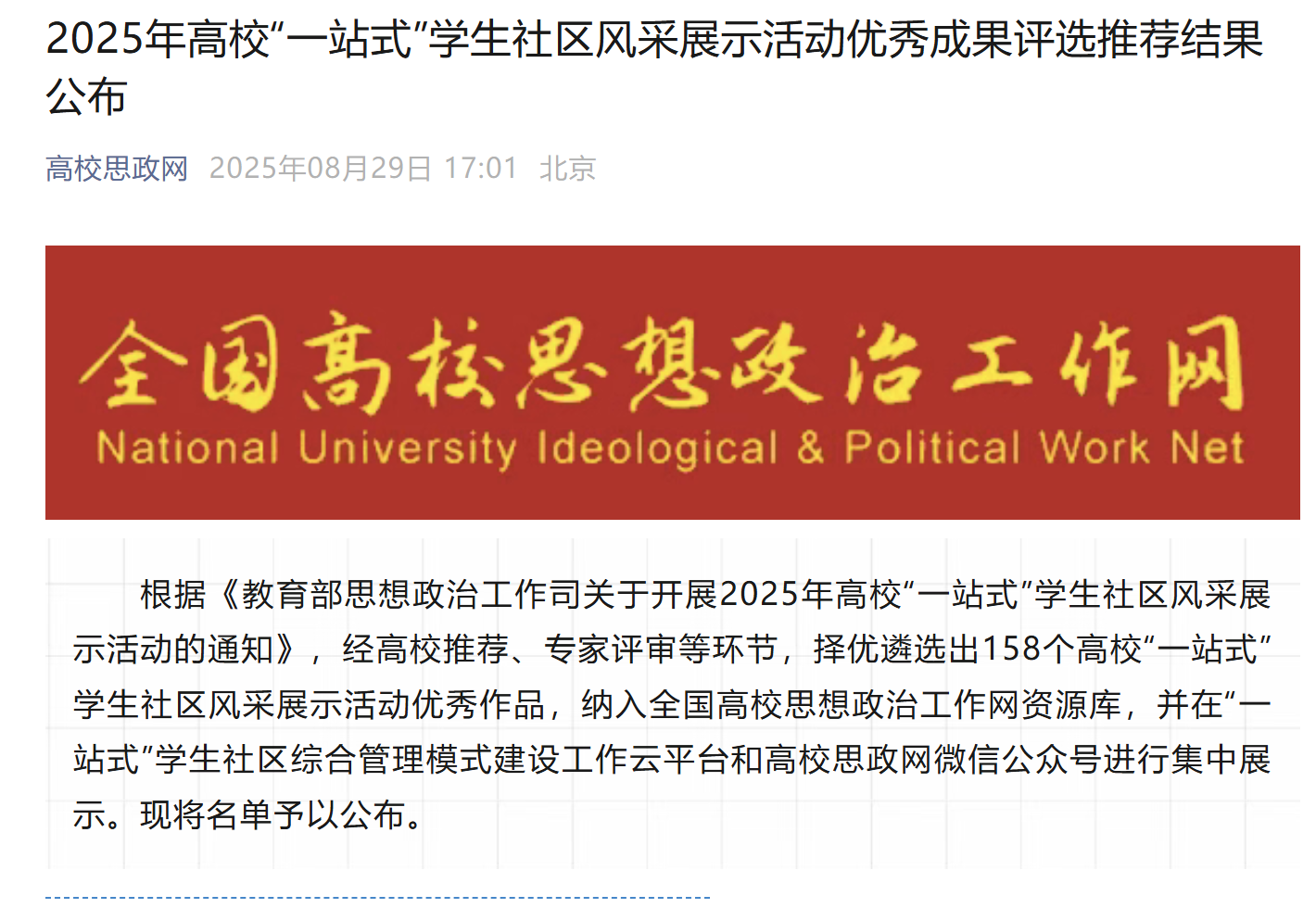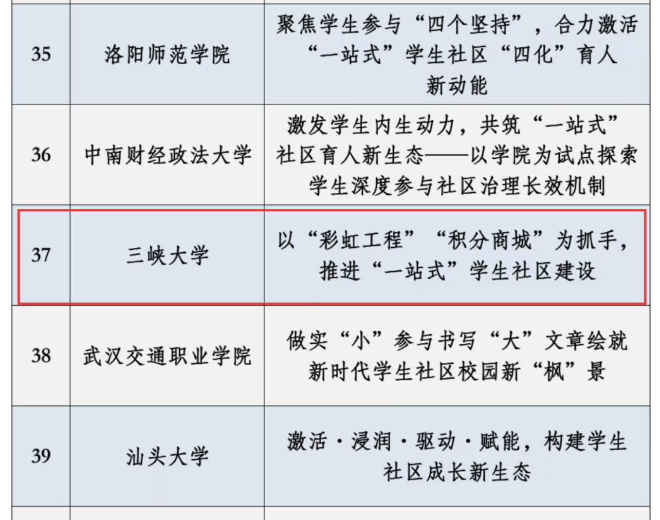 本网讯(通讯员 余杨铭 艾力) 近日,教育部思想政治工作司公布了2025年高校“一站式”学生社区风采展示活动优秀作品名单,共有158件作品入选。三峡大学报送的《以“彩虹工程”“积分商城”为抓手推进学生社区建设》《 “思政流量”如何变现育人价值?“一站式”学生社区给出青春答案》两项案例成功获选,并被纳入全国高校思想政治工作网资源库。这些作品即将在“一站式”学生社区综合管理模式建设工作云平台及高校思政网微信公众号进行集中展示。此次两项案例同时入选,标志着学校在“一站式”学生社区建设中的创新实践获得全国教育领域的高度认可,从“实践探索”阶段迈向“全国示范”行列。
