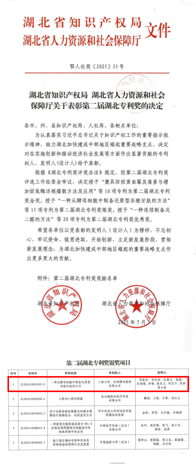 本网讯(通讯员 翟小红) 近日,湖北省知识产权局、湖北省人力资源和社会保障厅联合发布《关于表彰第二届湖北专利奖的决定(鄂人社奖〔2025〕33号)》,我校生物与制药学院和安琪酵母股份有限公司联合开发的专利《一种从酵母细胞中制备还原型谷胱甘肽的方法》,获第二届湖北专利奖银奖,成为本届唯一获此殊荣的省属高校,彰显了学校服务地方高质量发展的积极成效,以及在知识产权创造、运用、保护和管理能力的跃升,充分体现三峡大学在深度融入地方产业发展的责任担当。