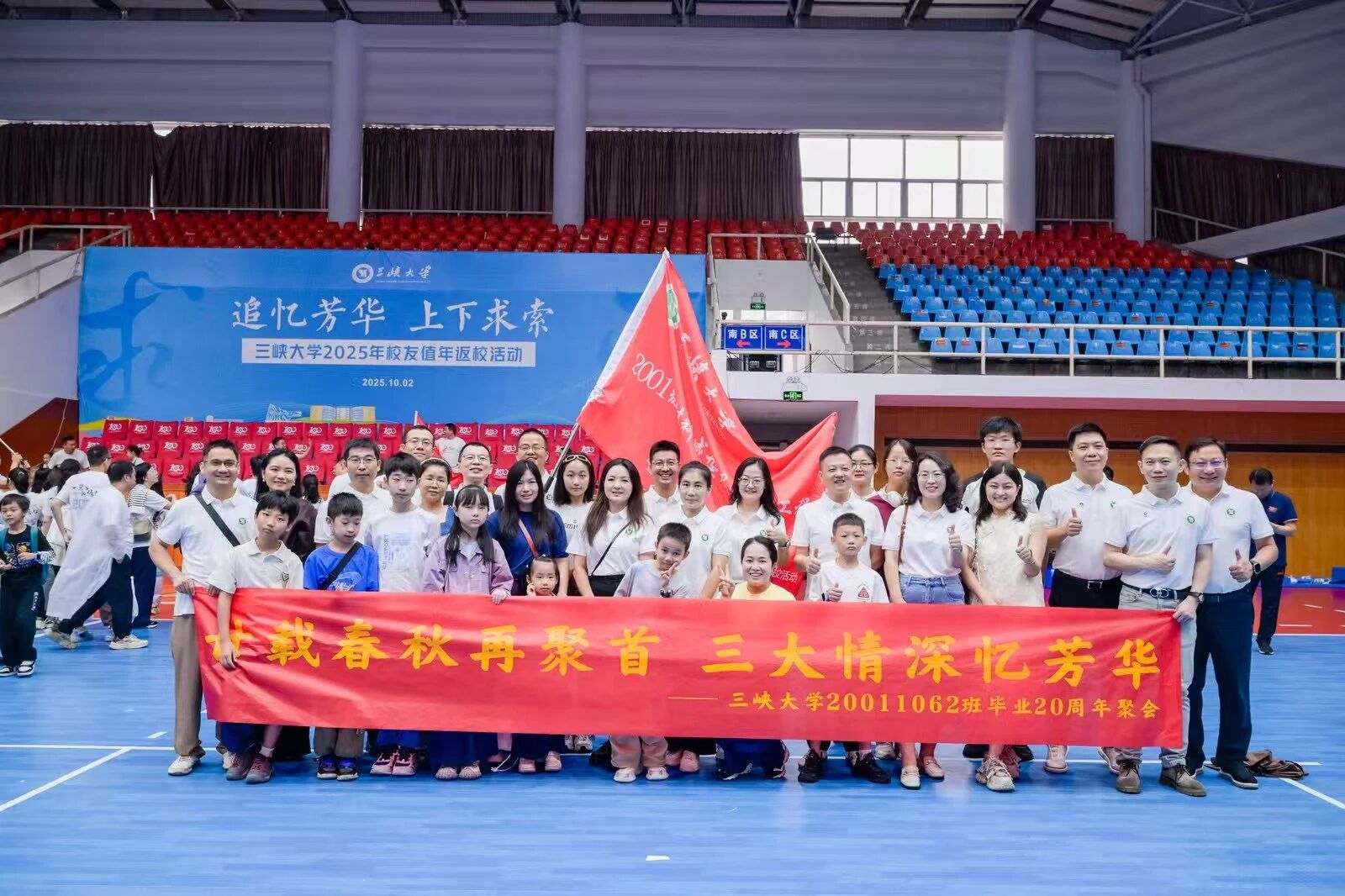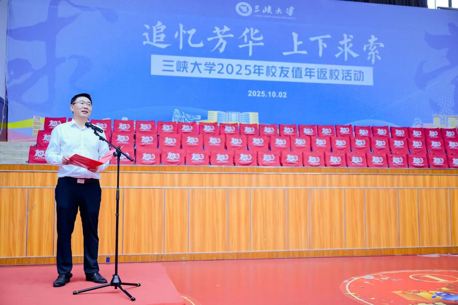 本网讯(通讯员 陈云龙)雨润归途,情暖三峡。10月2日,广大校友携亲友近1000人重返母校,参加2025年校友值年返校活动。当天上午,学校在大学生体育馆举行健步走打卡活动启动仪式,党委书记、校友总会会长何伟军,党委常委、副校长、校友总会秘书长张锐,各学院分管校友工作领导,600余名返校校友参加了启动仪式,仪式由张锐主持。