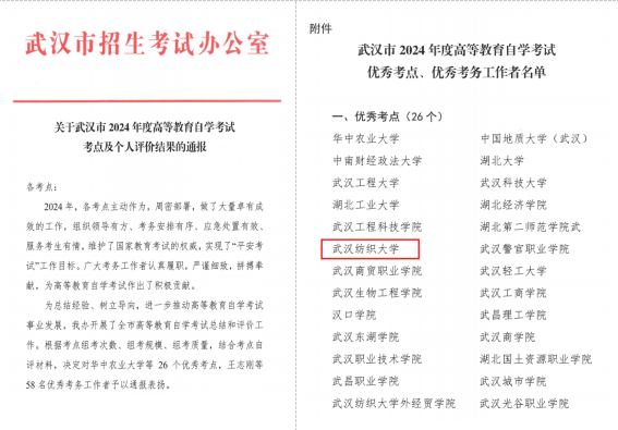 近日,武汉市招生考试办公室发布了《关于武汉市2024年度高等教育自学考试考点及个人评价结果的通报》,我校再次被评为自考优秀考点,继教学院张娟同志被评为优秀考务工作者。