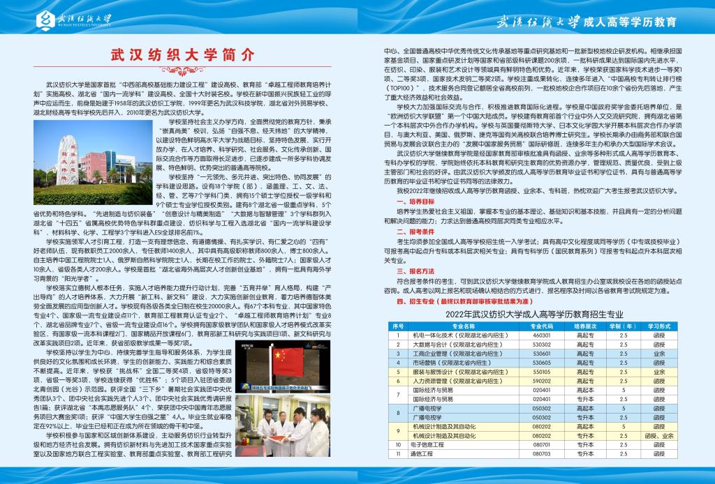 当前位置:首页 > 成考招生 > 武汉纺织大学2022年高等学历继续教育招生简章