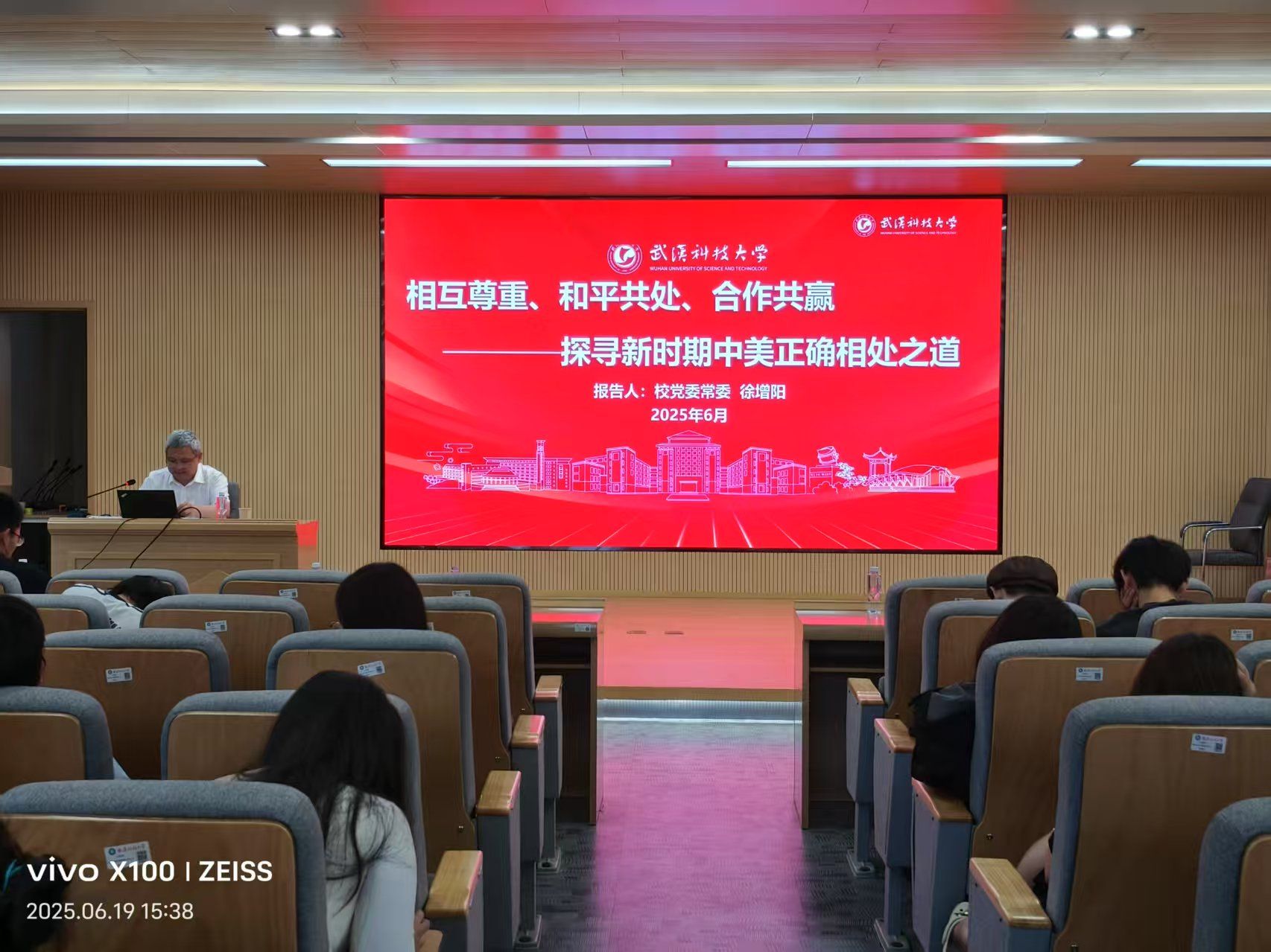 武科大网讯(通讯员 凃薛亮)6月19日下午,一堂深刻而富有启迪的专题思政课在武汉科技大学法学与经济学院学术报告厅开讲。校党委常委徐增阳以《探寻新时期中美正确相处之道》为题,为学院全体领导班子成员、师生代表以及武汉科技大学继续教育学院教师代表带来了一场有深度、有温度、有情怀的思想盛宴。此次课程也体现了学校优质教育资源向更广泛学习者辐射的开放理念。