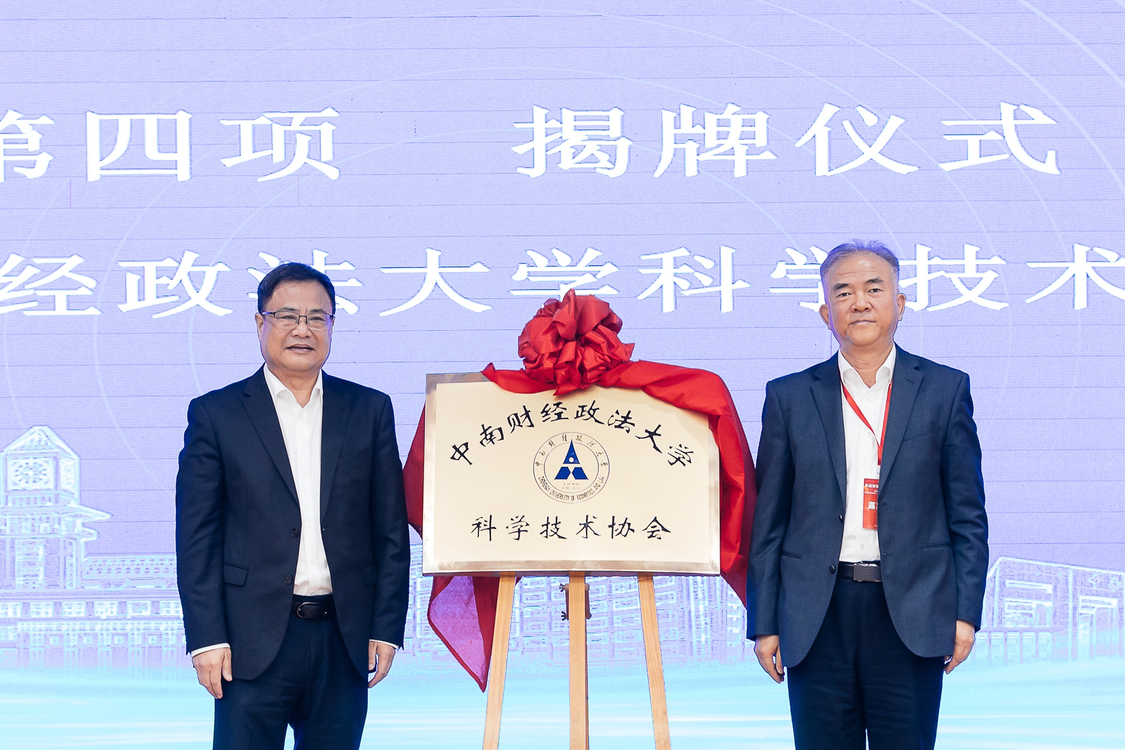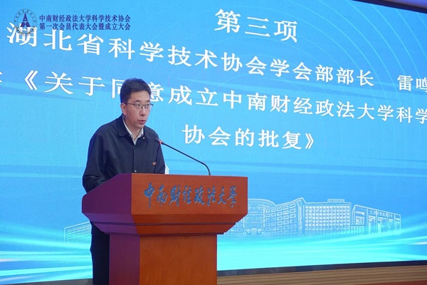 湖北省科学技术协会学会部部长雷鸣宣读《关于同意成立中南财经政法大学科学技术协会的批复》,湖北省科学技术协会党组成员、副主席孙击翔与校党委书记侯振发共同为“中南财经政法大学科学技术协会”揭牌。