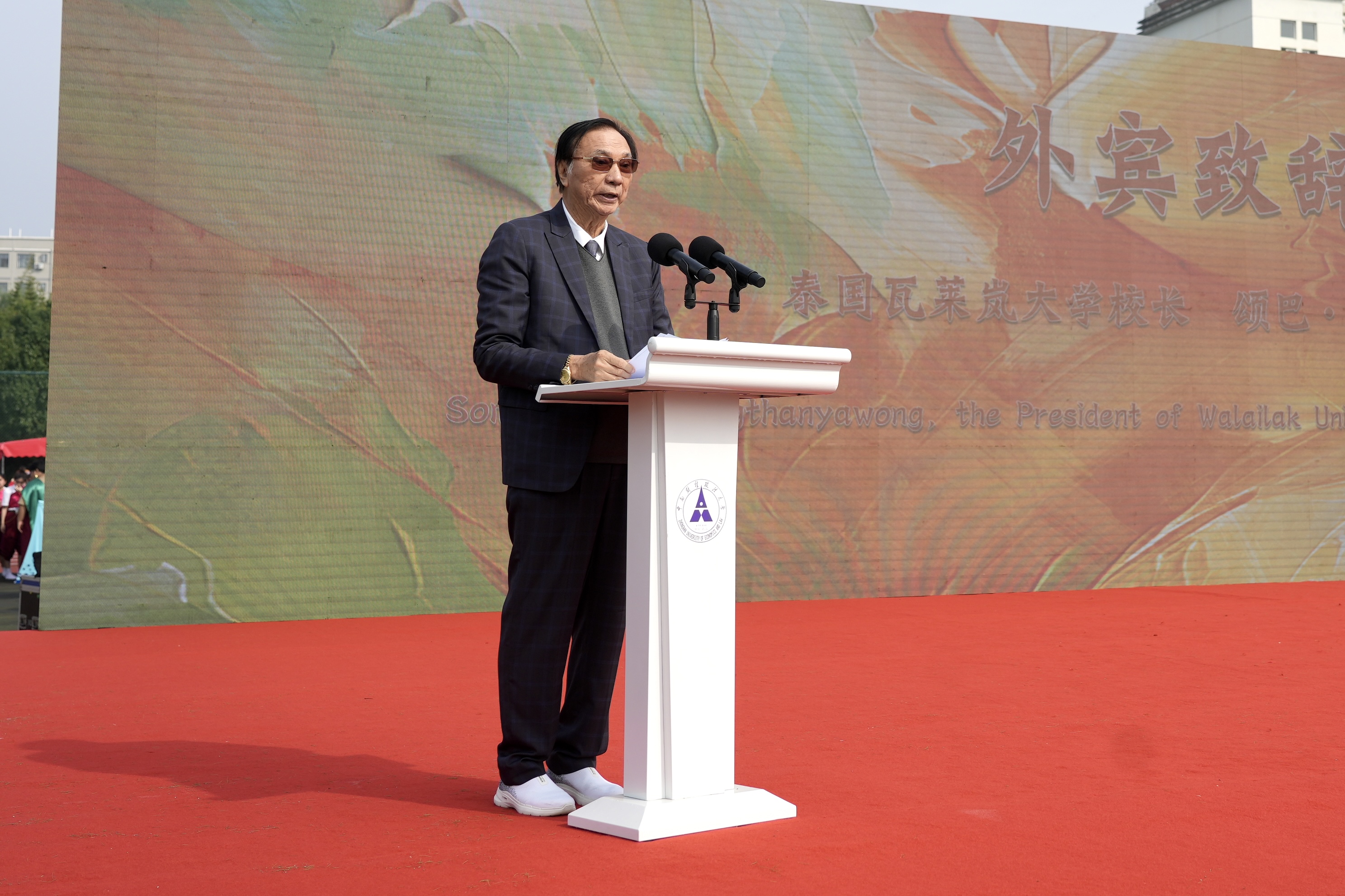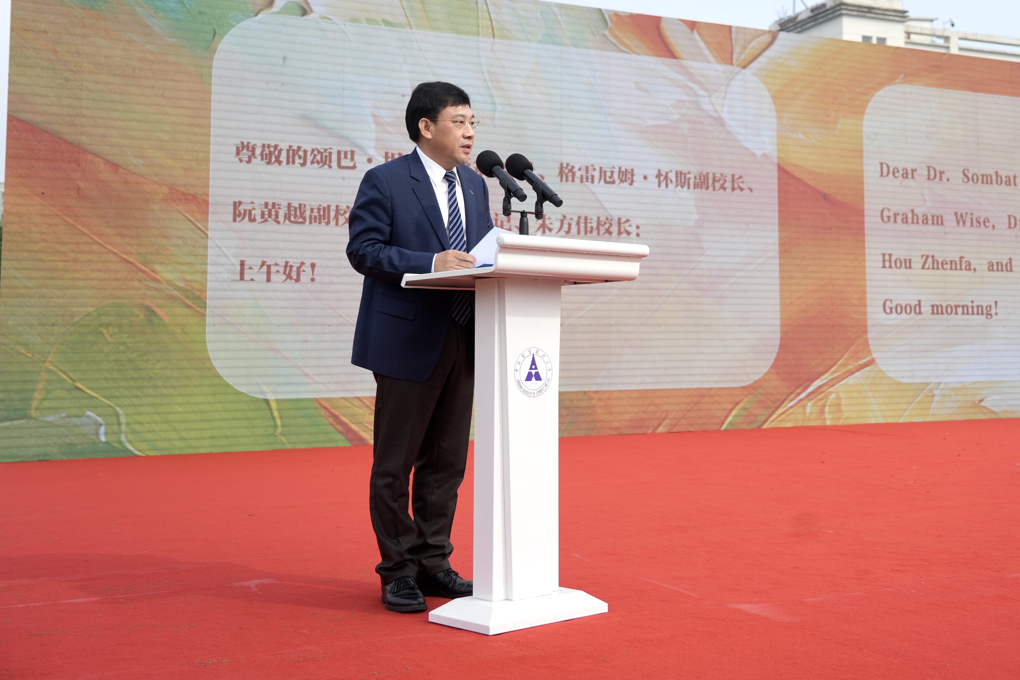 开幕式现场高朋满座,气氛热烈。中南财经政法大学党委书记侯振发,校长、党委副书记朱方伟,党委副书记陈狮,以及泰国瓦莱岚大学校长颂巴·坦荣潭亚翁、新西兰坎特伯雷大学副校长格雷厄姆·怀斯、越南商业大学副校长阮黄越等中外高校领导及企业嘉宾出席开幕式并致辞。开幕式由校党委常委、副校长刘仁山主持。