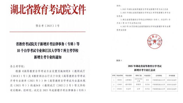 湖北省教育考试院公布了2025年自学考试新增开考专业目录,全省共计新增开考10个专业。我校申报的社会学(专升本)、城市管理(专升本)、法律事务(专科)3个自学考试专业获批开考,为近些年来我省单次新增开考专业最多的高校。新专业的开考将有助于我校在新课改后保持自学考试发展的后劲和比较优势,实现以优质专业为龙头的高质量发展。